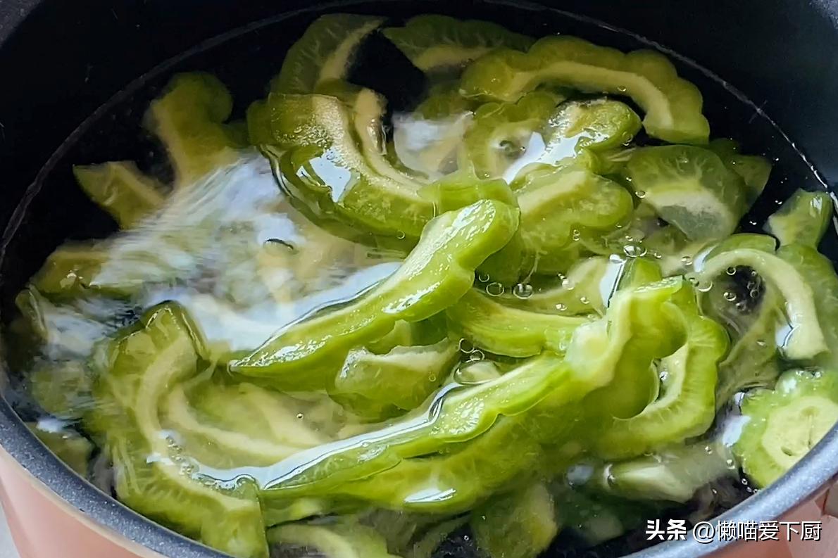 2、鍋中水開下苦瓜,加些食油和食鹽,焯燙30秒後撈出來過遍涼水,再控幹水分;