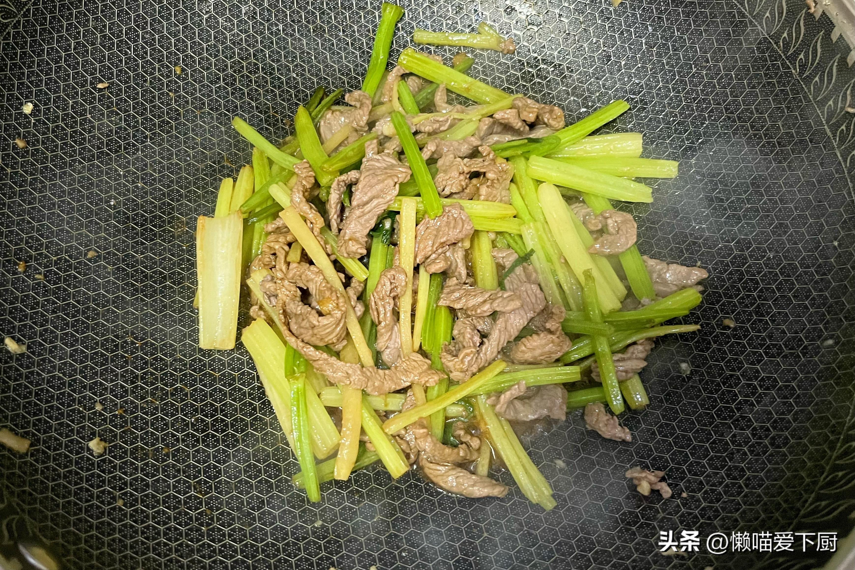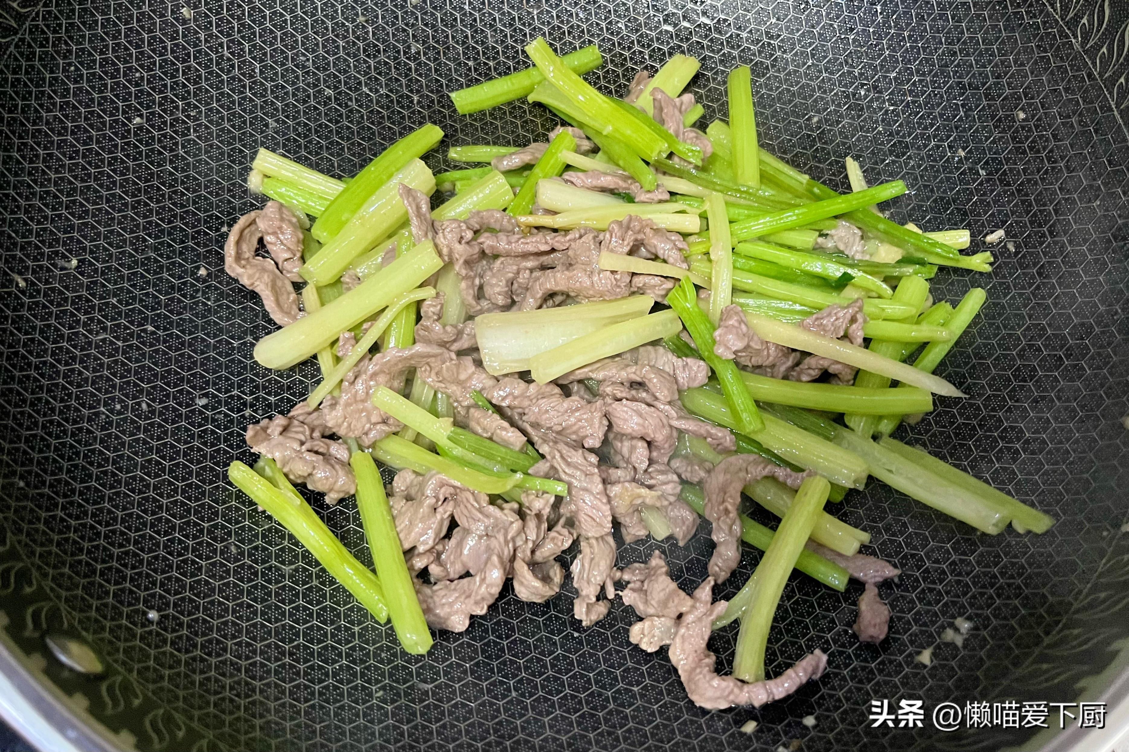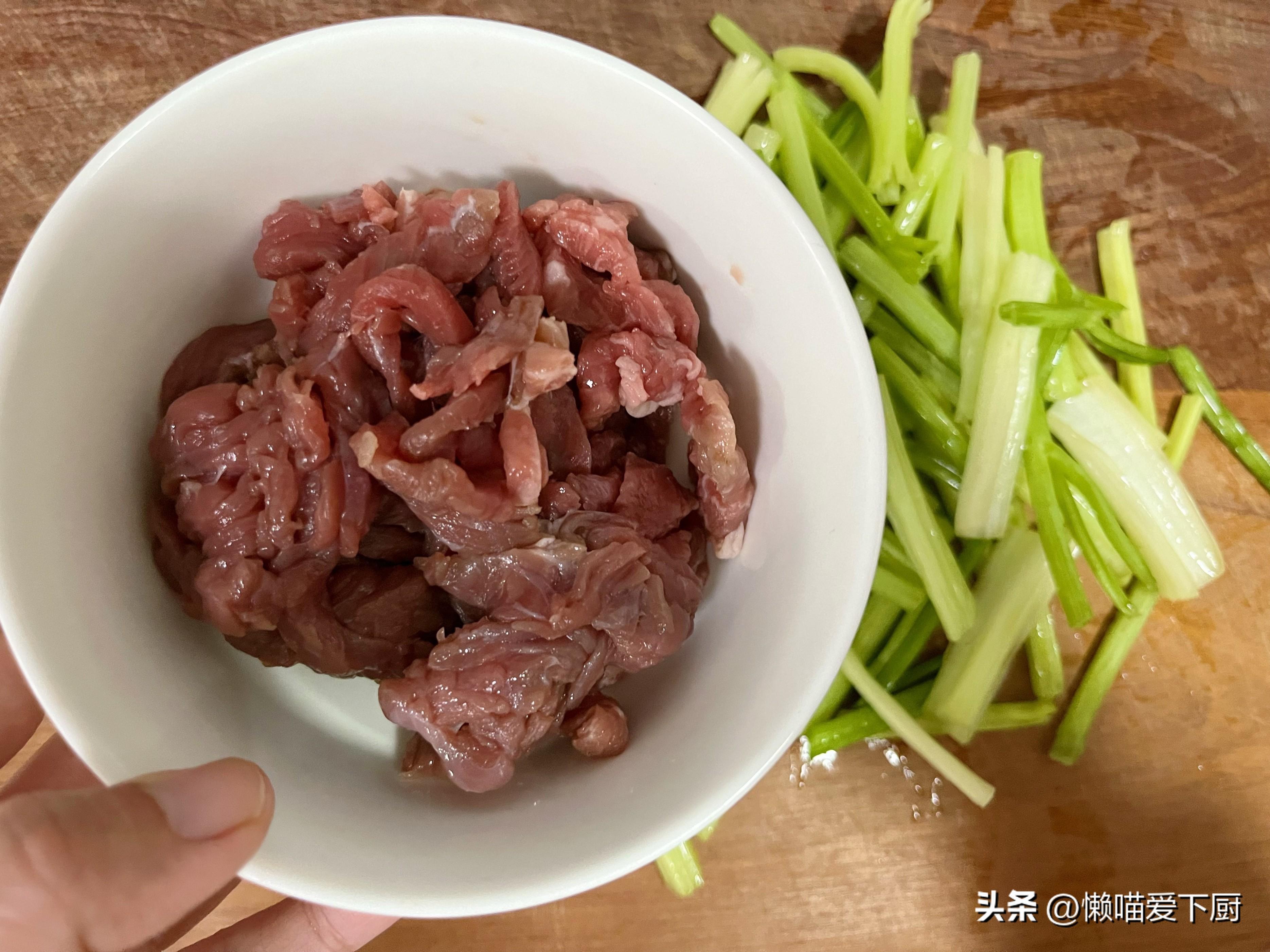 1、瘦牛肉逆着紋路切薄片,芹菜洗淨後切小段;
