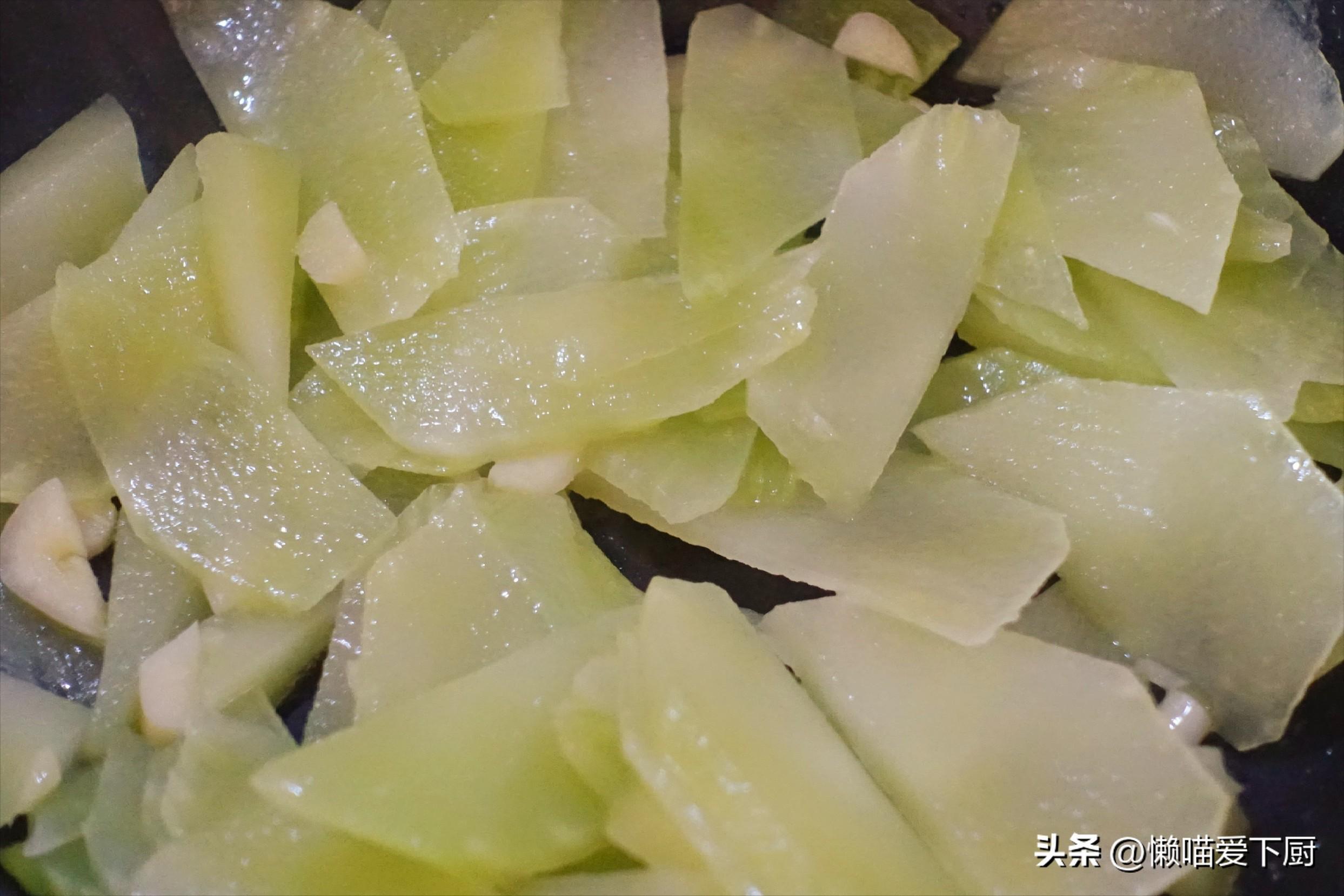 3、另起鍋加油,加蒜末炒香,再下入萵筍;