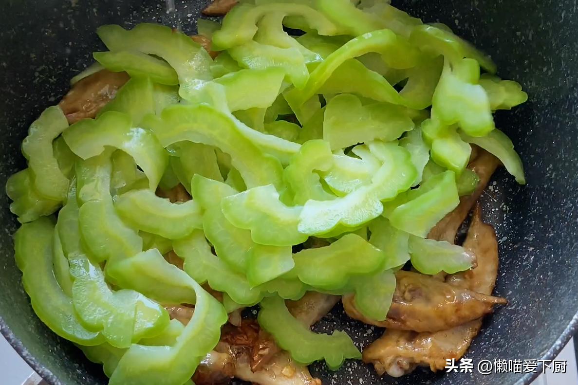 5、炒至上色後,倒入苦瓜,繼續翻炒2-3分鐘,即可出鍋享用。