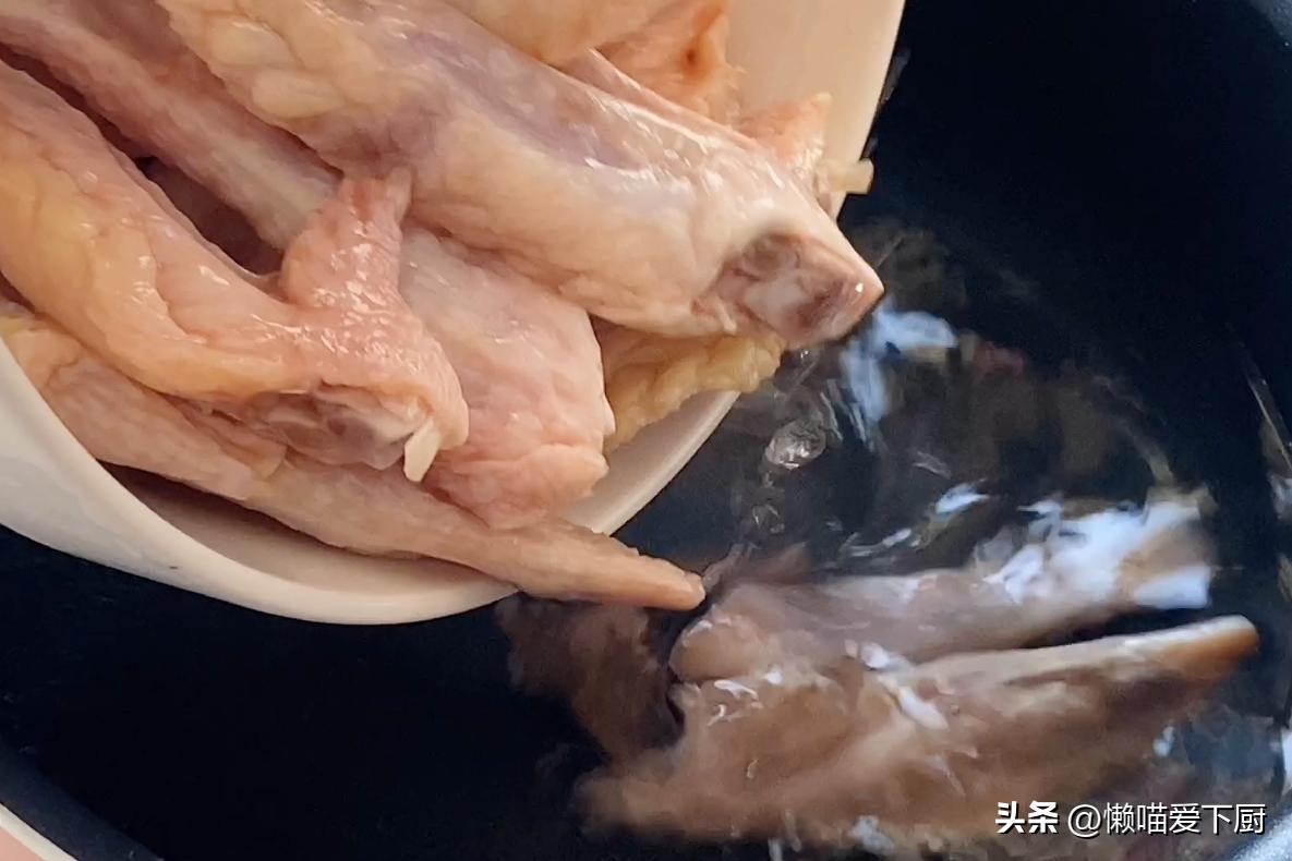 3、雞翅尖冷水下鍋,放幾片生薑,煮出浮沫後撈出來備用;