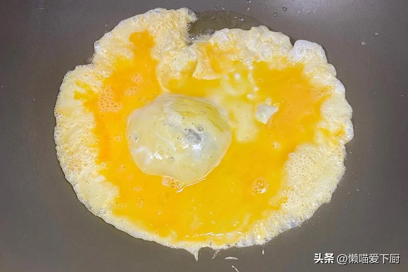 2、雞蛋敲入碗中,加些食鹽攪勻,再下油鍋煎熟、鏟小塊;