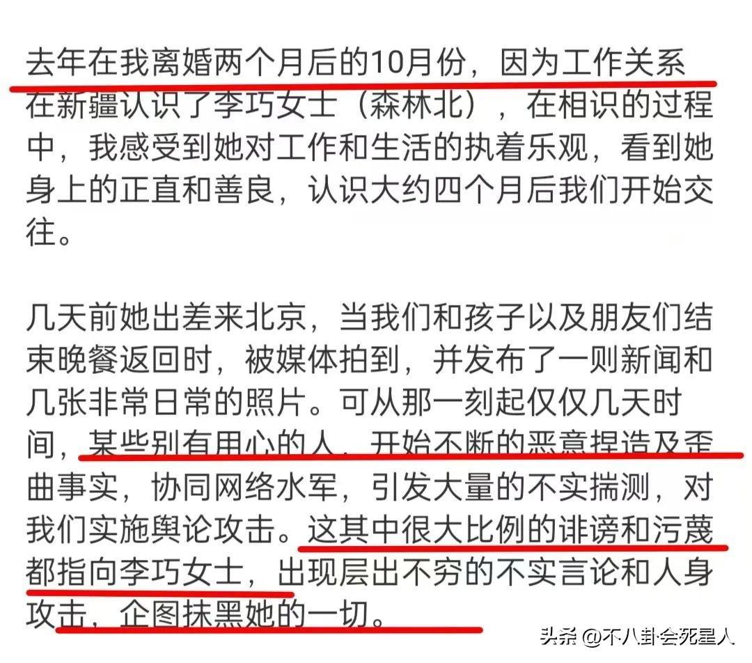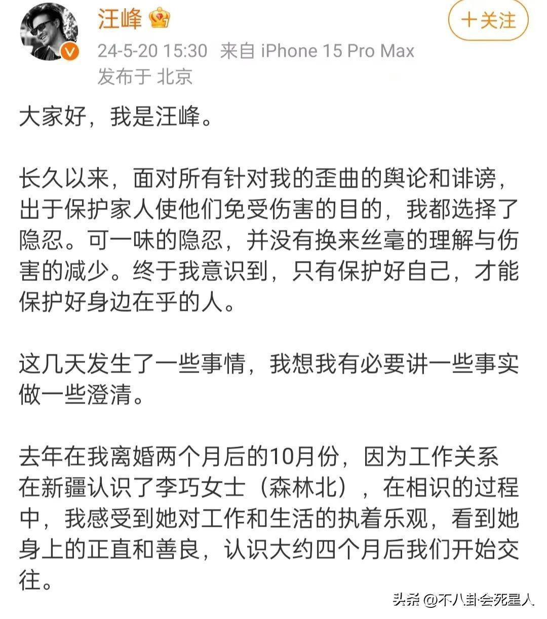 如圖,汪峯髮長文稱他一直以來受到各界的歪曲和誹謗,都選擇了隱忍,但是一味的隱忍,並沒有換來傷害的減少,他必須要站出來說話,作出澄清。他和李巧(網紅森林北)是在去年10月份,因爲工作關係認識的。