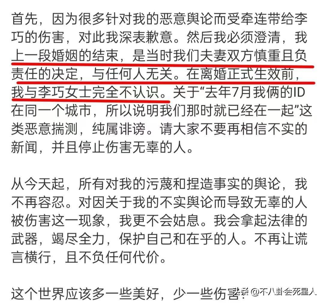 汪峯表示,因爲他讓李巧承受了許多負面評論,對此他深感抱歉。他和前妻章子怡是和平分開,在離婚正式生效前,他和李巧並不認識。希望大家別聽信謠言,否則他會拿起法律武器,竭盡全力維權。