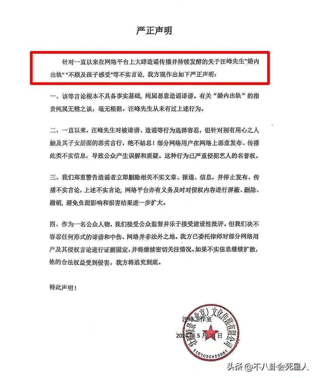 接着,汪峯工作室發佈維權聲明,表示“婚內出軌”“不顧及孩子感受”都是不實言論,正面回應葛薈婕。