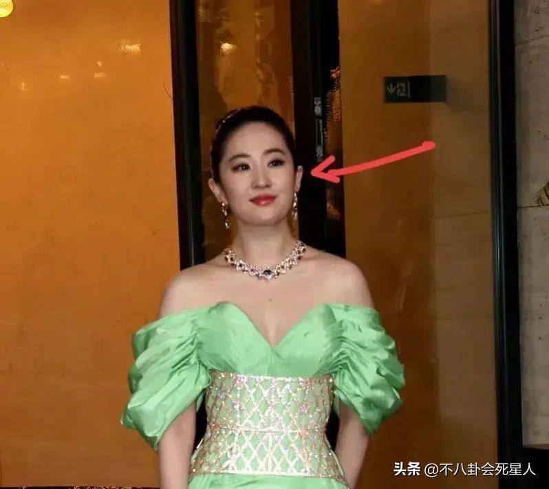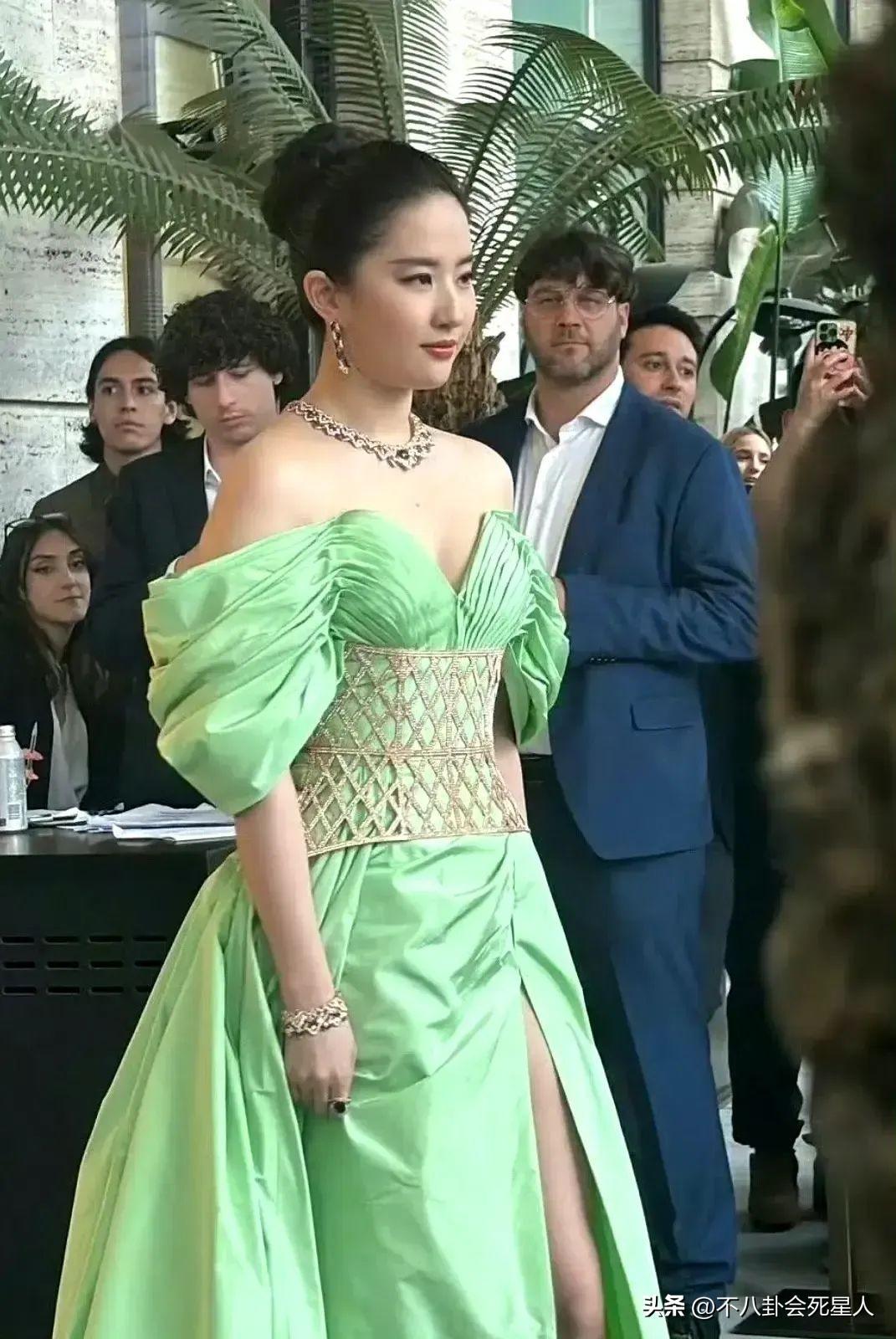 劉亦菲自從步入中年之後,“發福”一直是她最大的爭議,這次她選擇了一條綠色的抹胸一字肩禮服,中間有收腰的設計,這件禮服出自某高奢品牌,華麗無比。