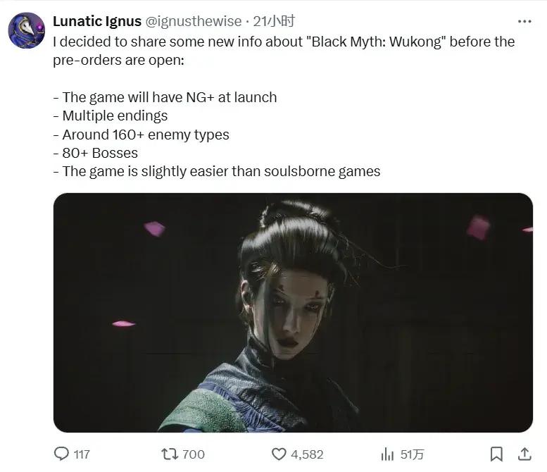 最初傳出這些消息的國外舅舅黨名爲Lunatic Ignus,其推特賬號僅有500位粉絲,目前他發佈的這條爆料推文收穫了51萬次查看和超過4000個點贊——《黑神話:悟空》官方推特發佈的消息甚至都沒有這麼高的熱度。