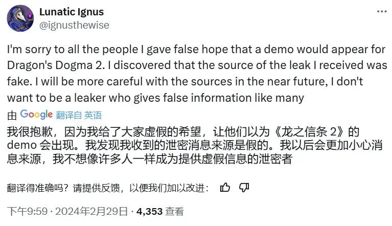 今年2月,他曾爆料《龍之信條2》的DEMO會在星期五(3月1日)發佈,後來他又聲稱自己收到的消息有誤,誤導了大家。