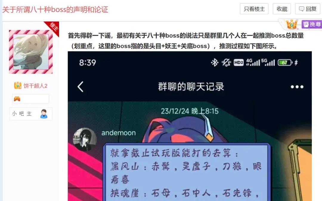第二天,當事人餅乾發帖澄清,80種BOSS的說法只是去年12月羣裏幾個人一起推測BOSS總數量,後來不知怎麼就被傳開了。