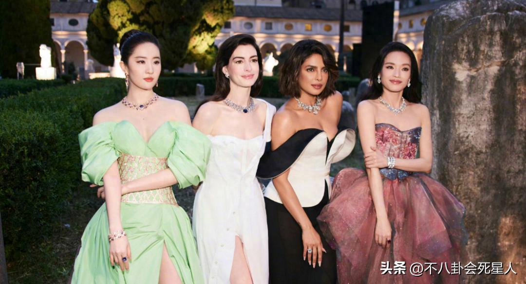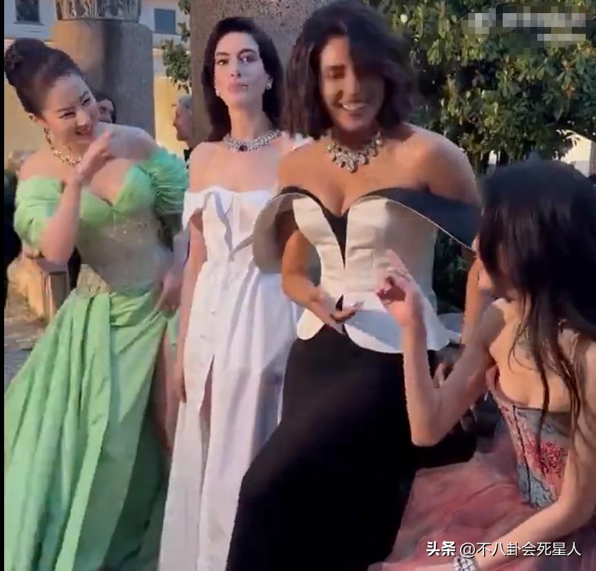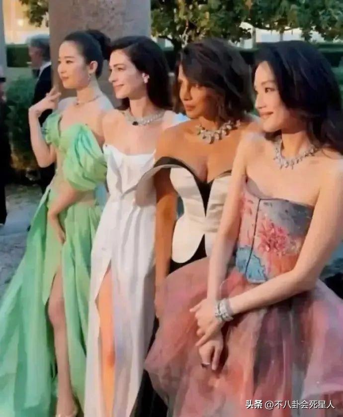 在國外活動上,有一段劉亦菲和舒淇,安妮海瑟薇以及另外一名女星在一起拍照的視頻,劉亦菲和舒淇分別站在兩邊,其他兩位國外女星站在中間。