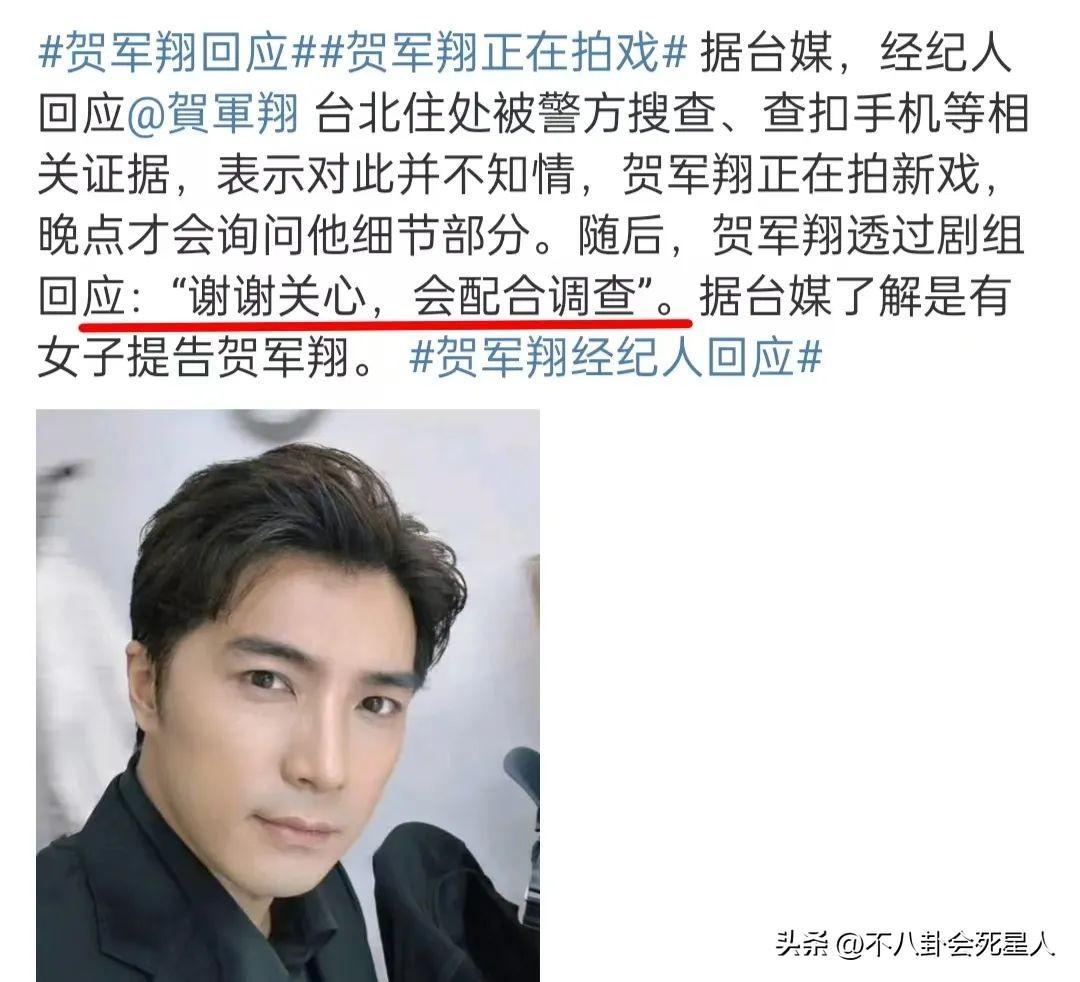 很快,賀軍翔經紀人回應表示不知情,賀軍翔正在拍戲,他通過劇組回應,“謝謝關心,配合調查”。