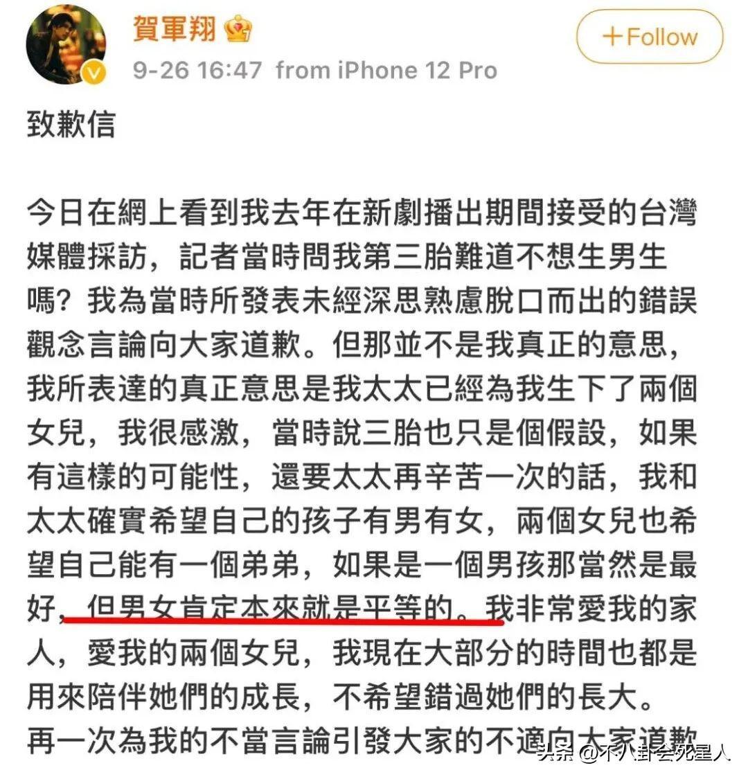 之後,賀軍翔髮長文解釋道歉,他說他在採訪中講的話是脫口而出,未經過深思熟慮的,太太已經爲他生了兩個女兒,他很感謝太太的付出,他和太太都希望自己的孩子有男有女,他沒有重男輕女的意思,認爲男女平等,非常愛他的兩個女兒。