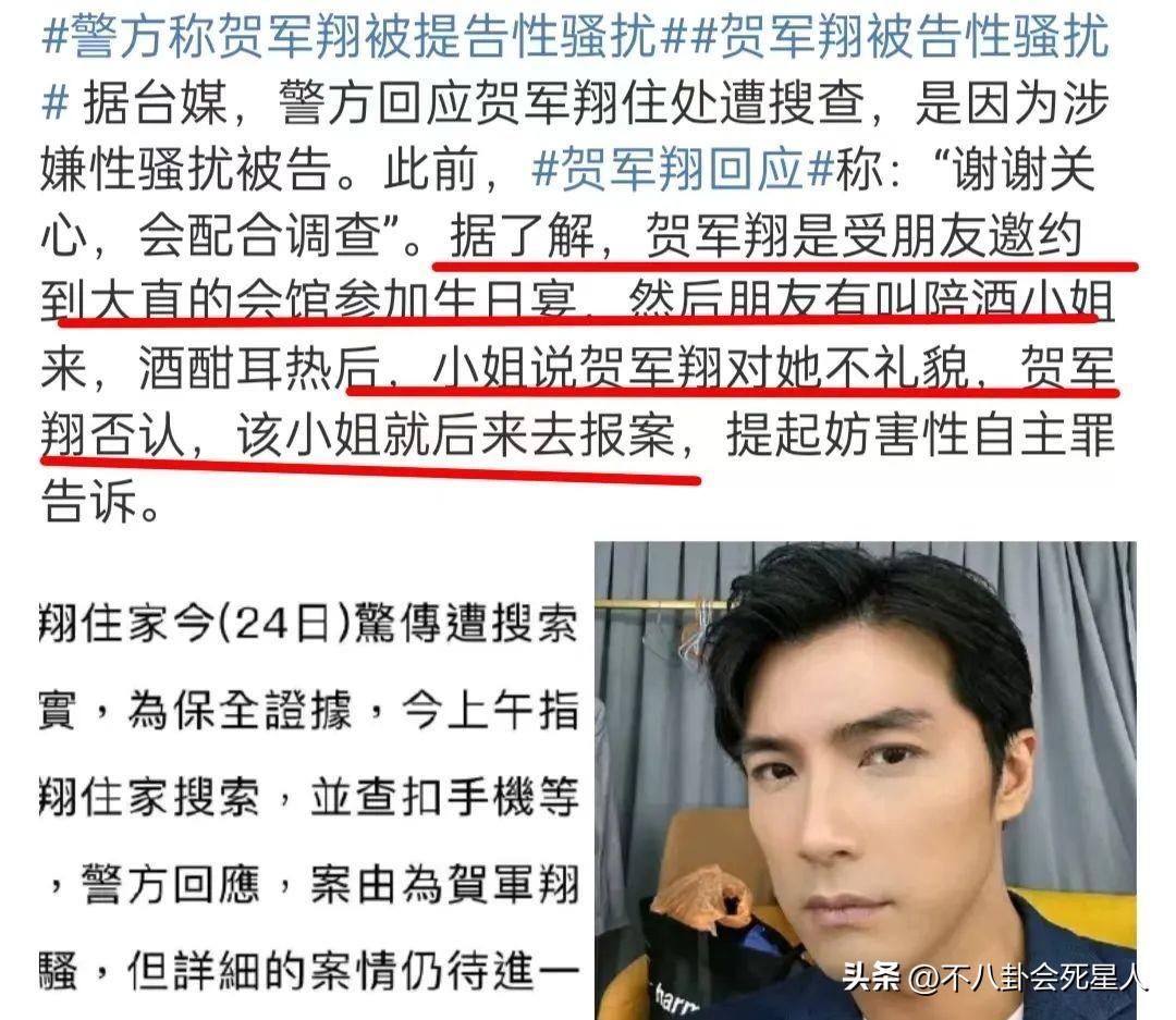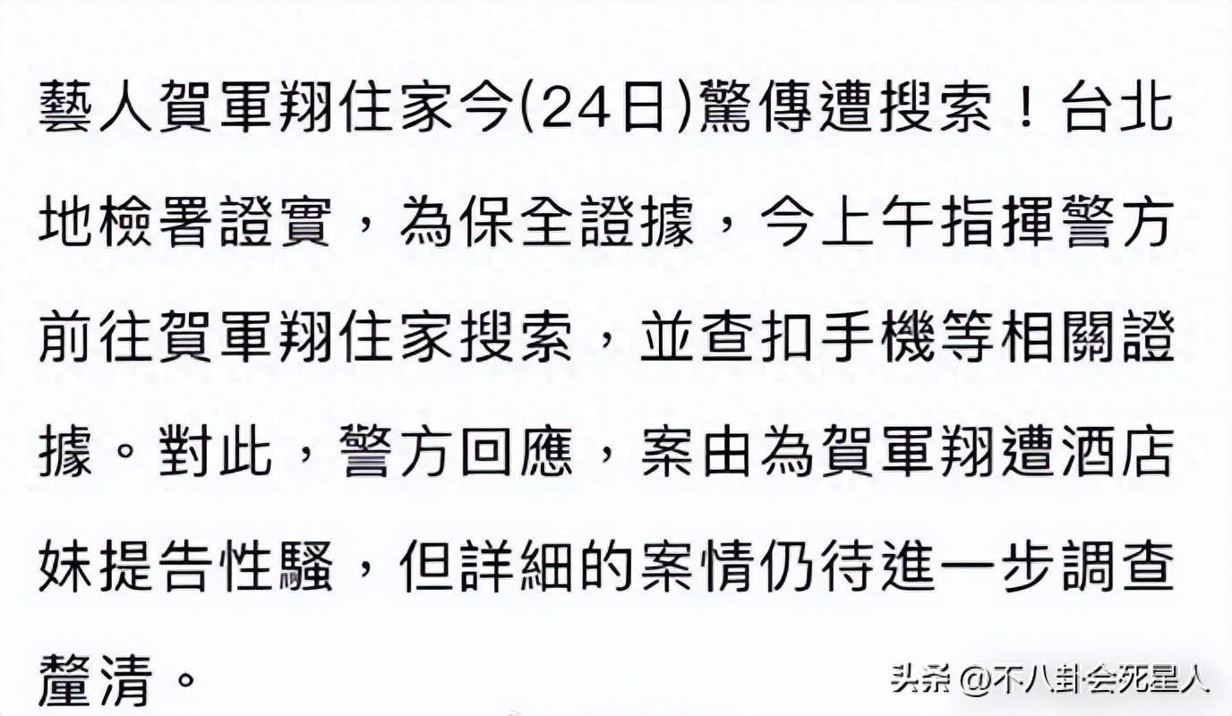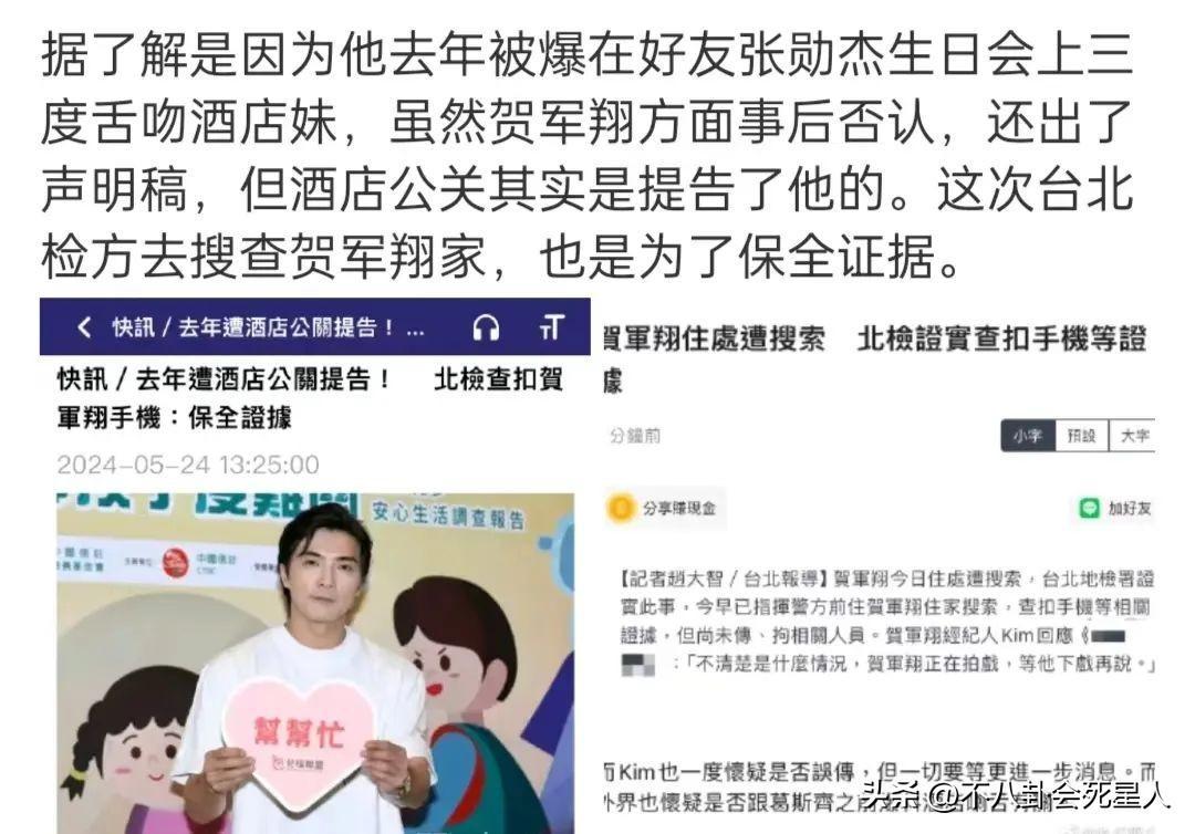 5月24日,據臺媒報道,有警方前往賀軍翔家中搜索,並查扣手機等相關證據,究其原因,警方回應是賀軍翔被酒店妹提告性騷擾,詳情還在進一步調查中。
