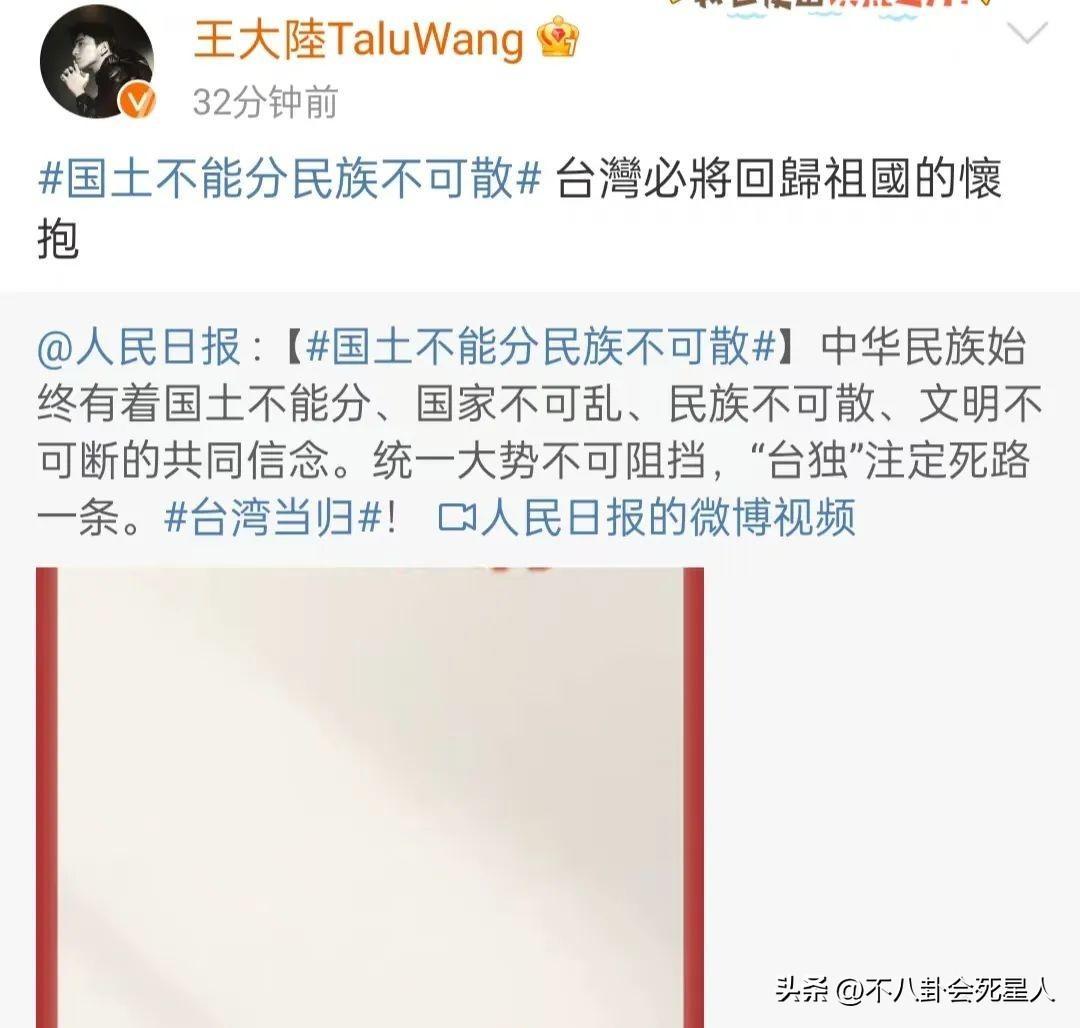 王大陸長期在大陸發展,他的態度十分端正,轉發表示,“國土不能分民族不可散”。