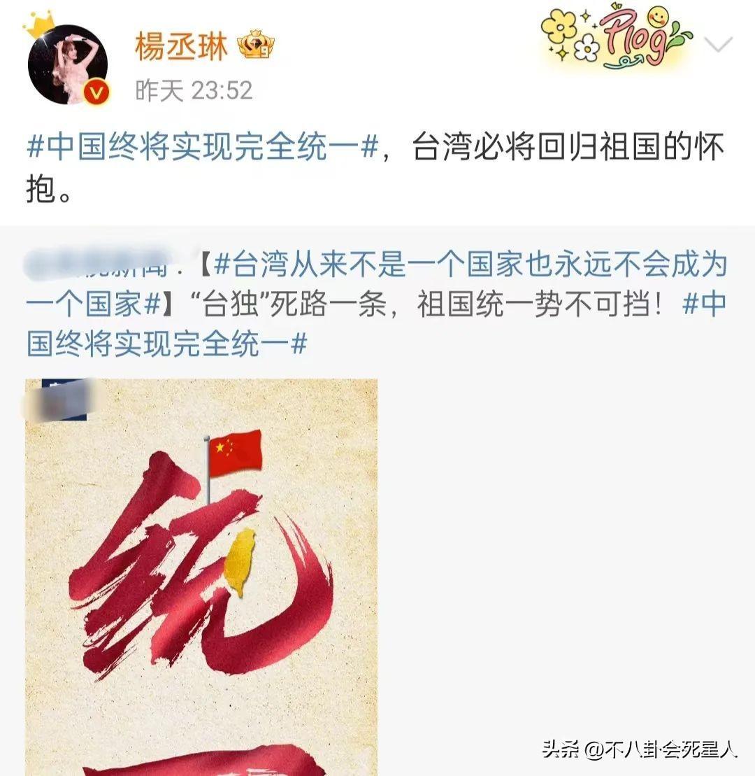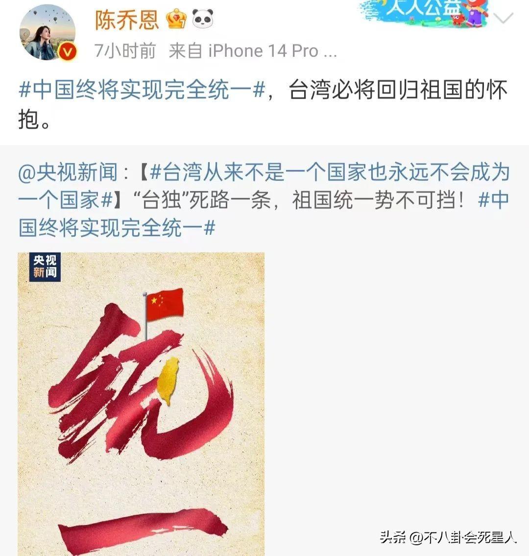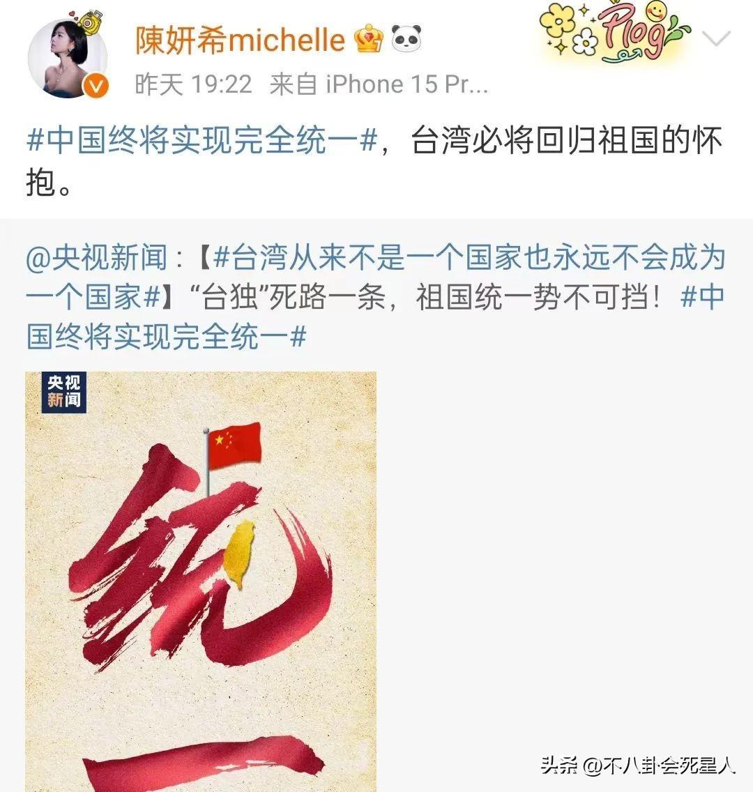 作爲楊丞琳的好友,同樣也是臺灣藝人,陳妍希也轉發了終將實現統一的言論。
