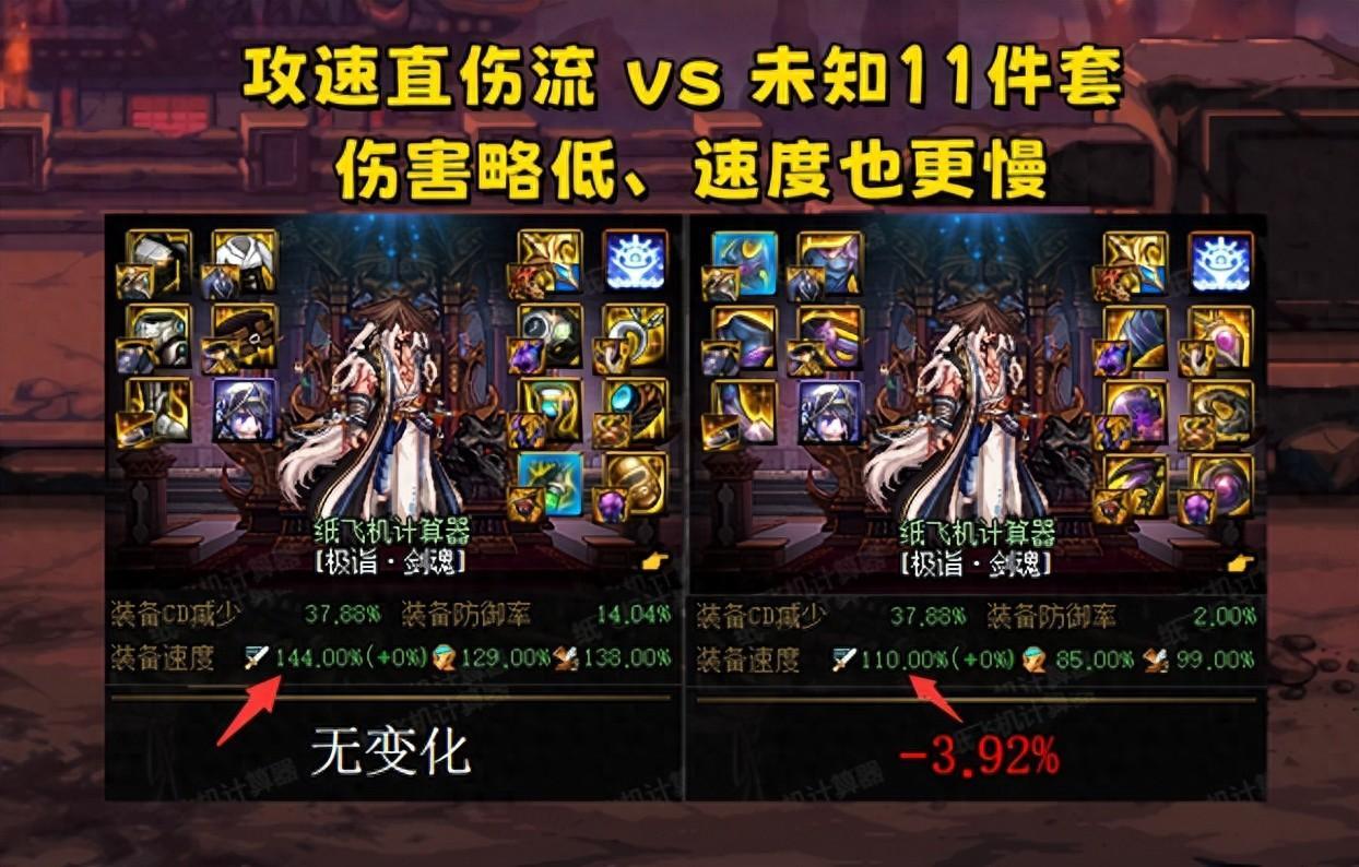 【1】直接穿戴防具+首飾+特殊部位的11件套,此時的“未知11件套”比“攻速直傷流”低了4%左右,可以用,但顯然還算不上完美搭配。