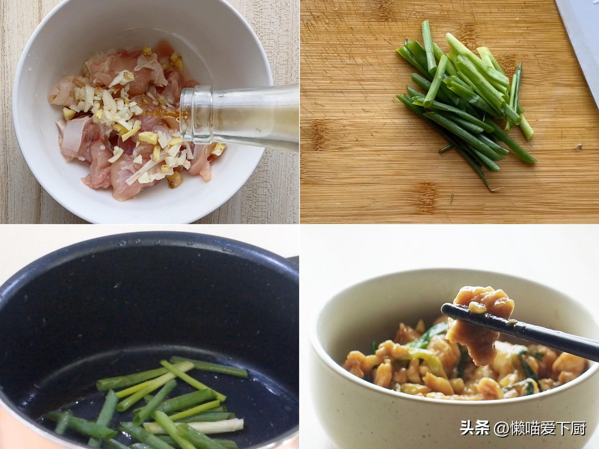 做法:雞腿去骨後切小塊,加些姜蒜末、料酒、生粉抓勻醃製30分鐘;小蔥洗淨後切成段狀;鍋中加油,下入蔥段煎至略微金黃,再加入雞腿肉;大火翻炒至雞腿肉熟透後,加些生抽、蠔油炒勻,再加少許清水,蓋上鍋蓋燜3分鐘,最後再加些蔥段即可盛盤。