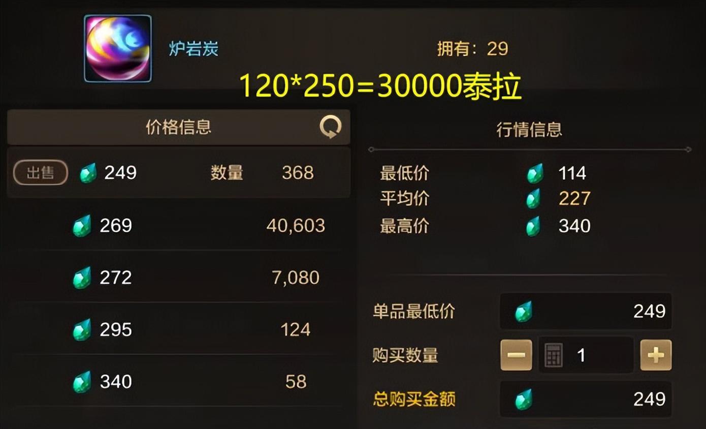 按照目前售價看,爐巖碳價格在250泰拉左右,那麼單單這120個爐巖碳的總收益,就已經達到了3萬泰拉!