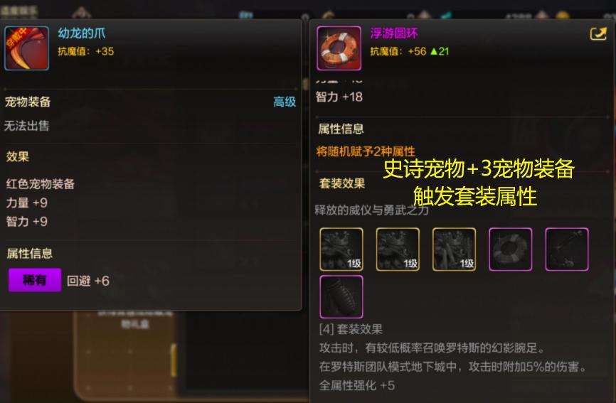 另外,當佩戴史詩寵物的同時,如果還佩戴了章魚的3個寵物裝備,那麼還可以觸發額外的套裝屬性5屬強、以及羅斯特團本的5%附加傷害!