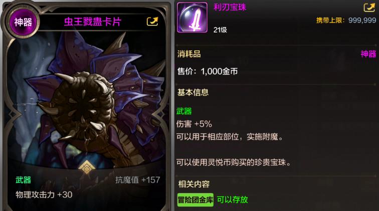 「裝備附魔」“武器”和“冒險勳章”選擇5%傷害(平民玩家用蟲王卡30物攻替代);“上衣”和“下裝”選擇力量;“首飾3件套”選擇屬強;