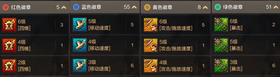 「裝備徽章」“武器+上衣+下裝+冒險勳章”推薦力量;“頭肩+腰帶”推薦攻速;“鞋子+手鐲”推薦移速;