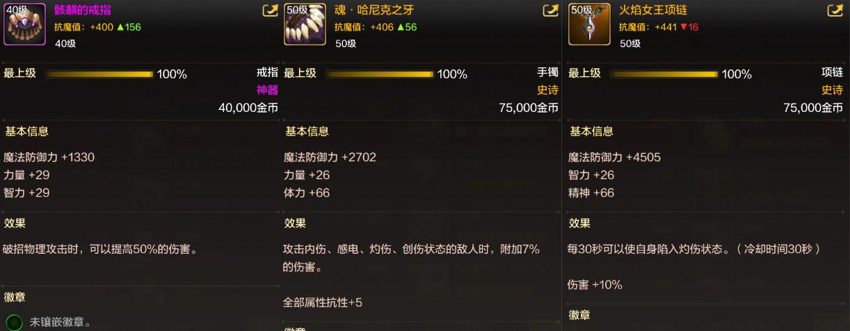 “骨戒”屬於物理職業首選,“哈尼克之牙”需要攻擊異常敵人觸發7%傷害,“女王項鍊”則會讓自身進入灼傷狀態掉血;