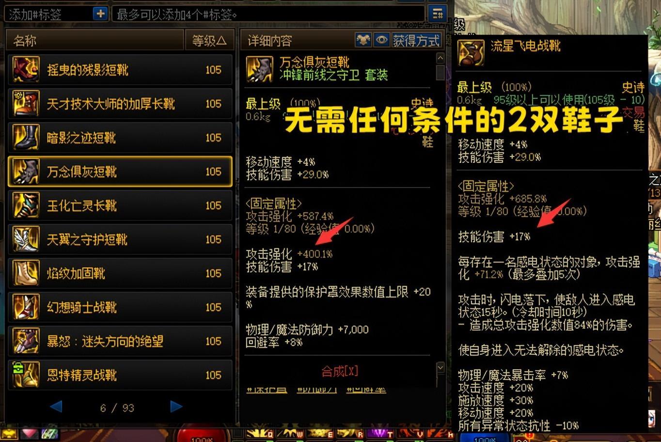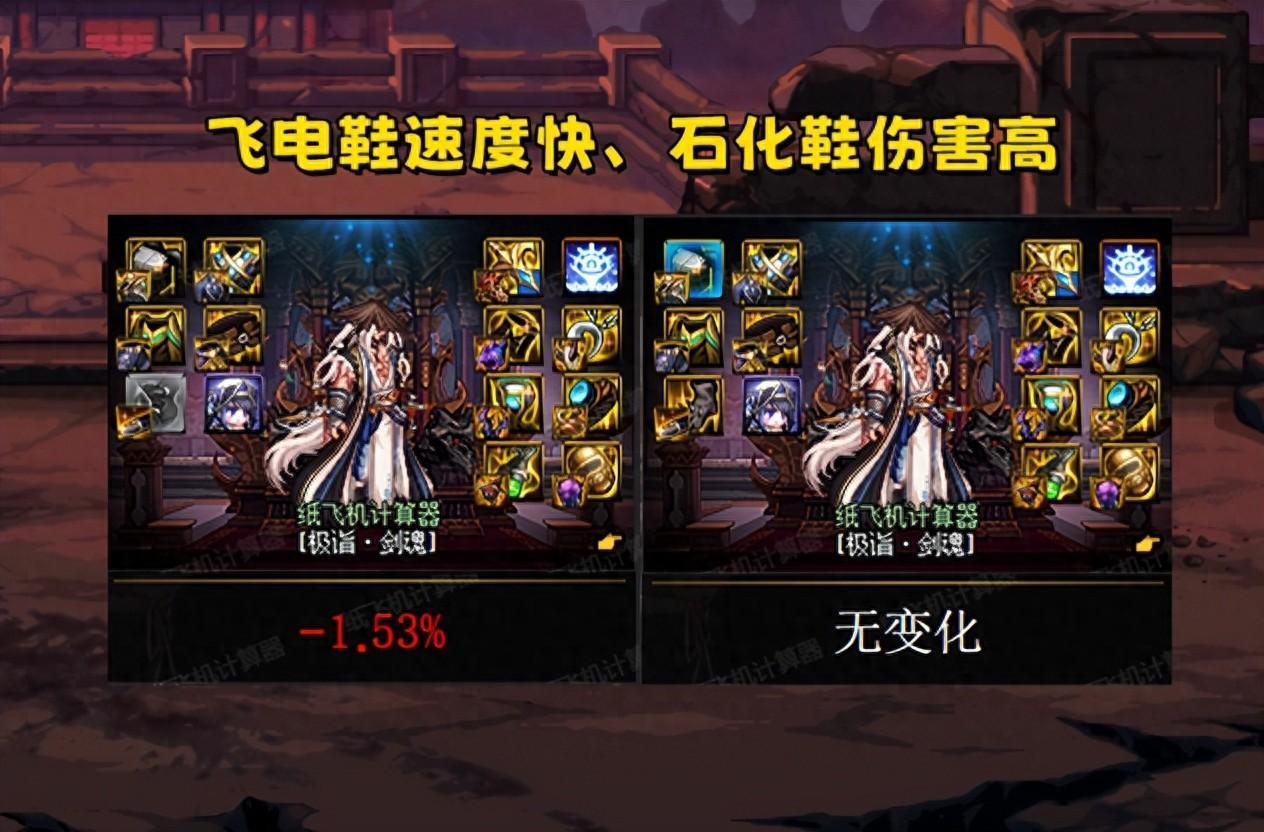 這2種搭配只是選擇鞋子不同而已,個人更推薦“萬念俱灰鞋”,一是傷害更高,大概比飛電鞋高了1.5%左右;