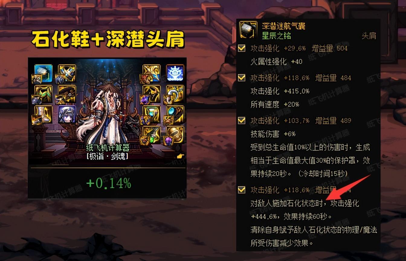 第一,更換深潛頭肩的“石化攻強詞條”,在其他部位全都一樣的前提下,還比萬念俱灰鞋高了約0.1%傷害;