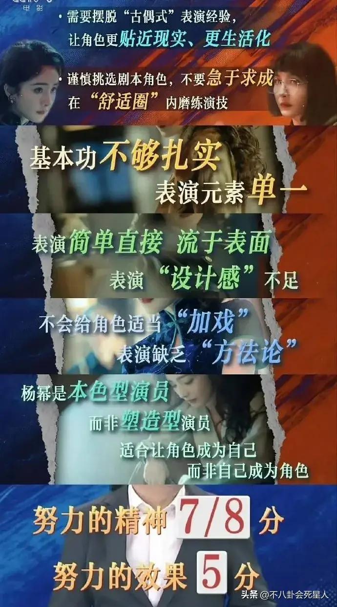 連央視的節目上都評價了楊冪的演技,列出了楊冪演技的短板,基本功不紮實,表演元素單一,表演流於表面等等。