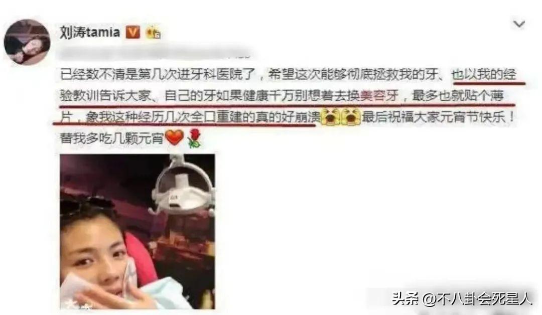 其實,劉濤做了全口牙齒重建,她曾多次發文傾訴整牙的煩惱,希望大家別盲目跟風,不建議大衆去弄美容牙,最多做個薄片,她說全口弄牙真的很崩潰。