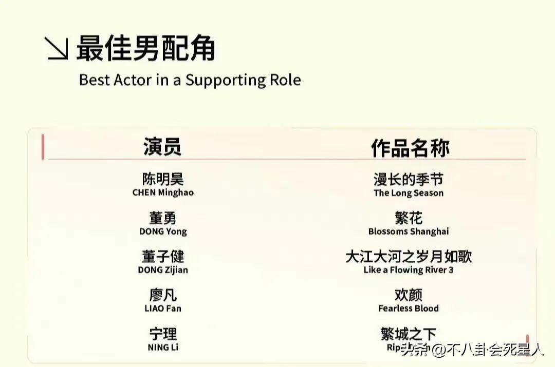 此外,最佳男配角入圍名單也公佈了,分別是陳明昊、董勇、董子健、廖凡和寧理。比起男主角的入圍,男配入圍爭議比較小。