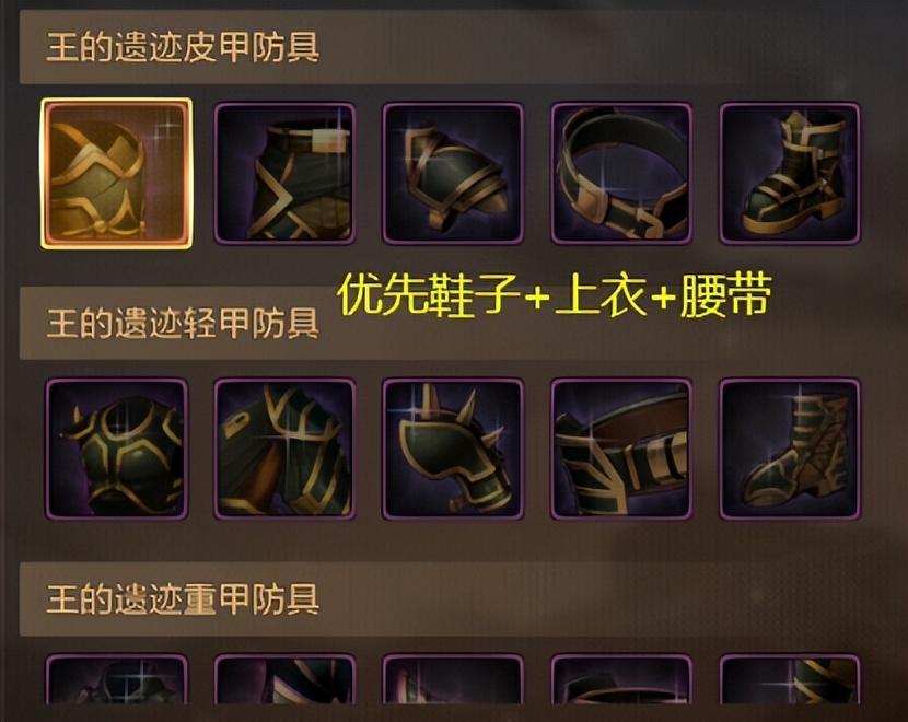 「防具」推薦“戰爭之王3/5件套”,其中鞋子、上衣、腰帶優先級較高,可以組成3件套,其餘部位有啥帶啥。