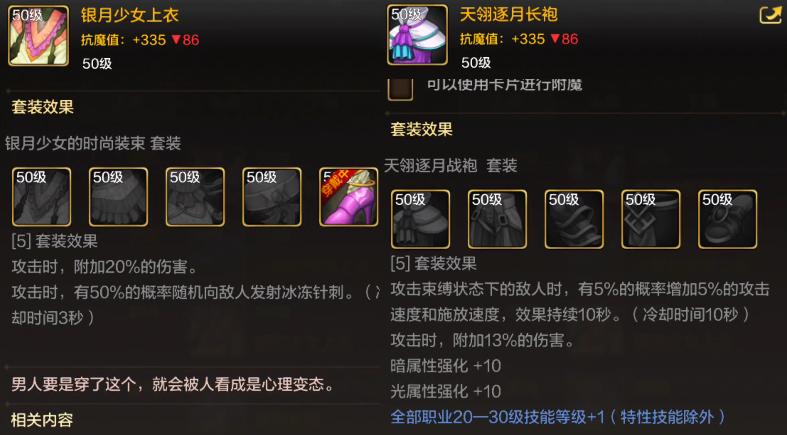 「防具」首推本命布甲“銀月少女套”,有高額屬強加持、5件套還有20%附加傷害;