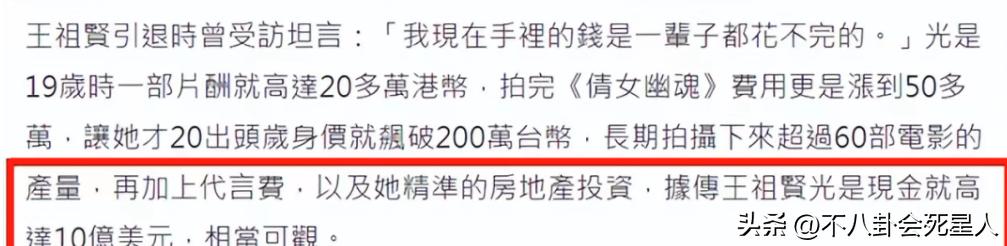王祖賢早年移居加拿大,早早就退圈了,但她憑藉年輕時在娛樂圈打拼積累了不少資產,光是在國內外就有好幾處豪宅。有傳王祖賢自己說過,手裏的錢一輩子也花不完。