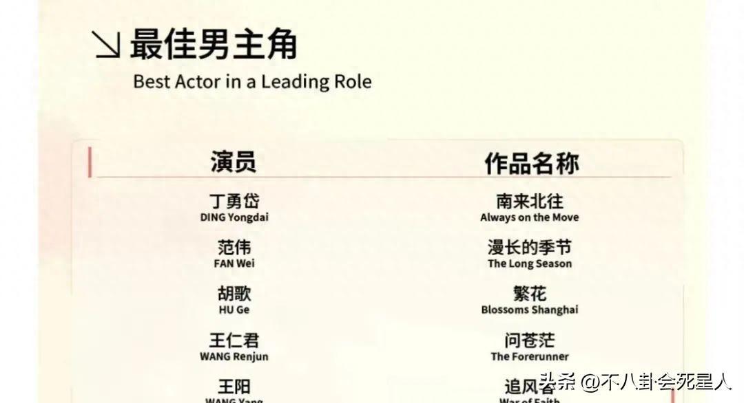 其實,丁勇岱也不是《南來北往》的男主,這部劇男主是白敬亭,但是提名的是丁勇岱,或許白玉蘭真的不看番位吧。
