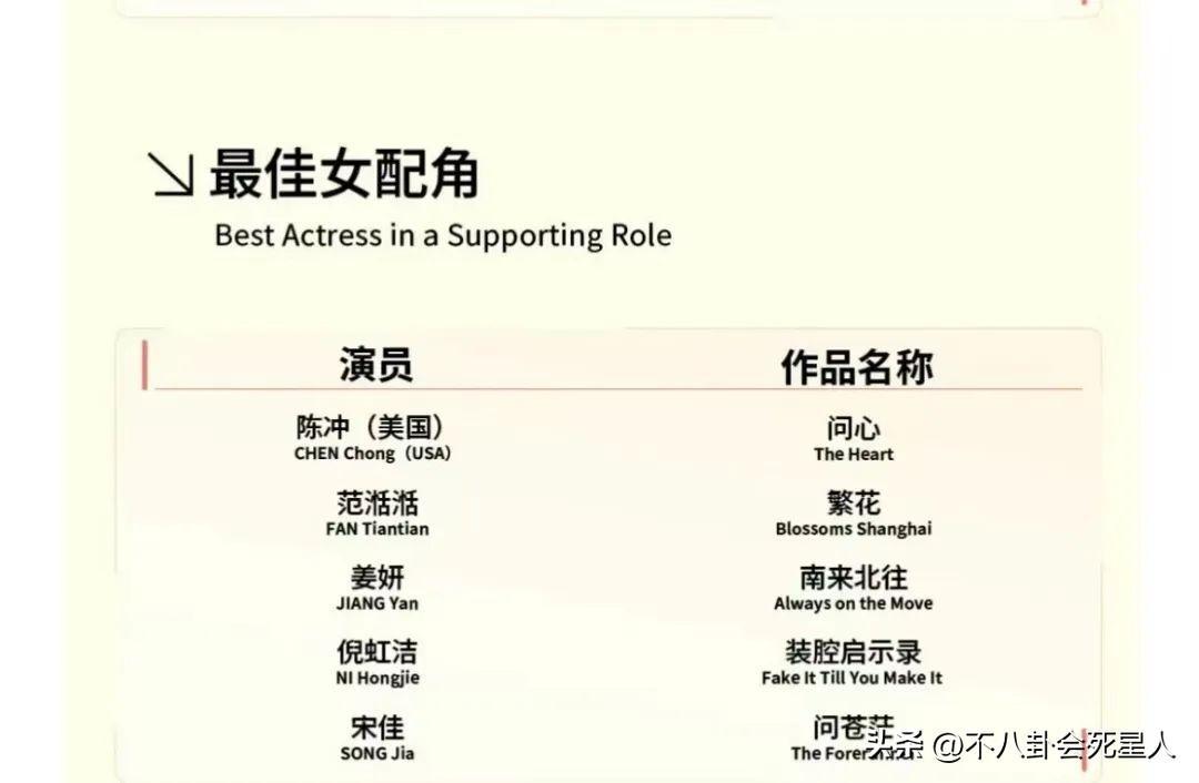 再來看入圍的女配角名單,分別是陳沖、範湉湉、姜妍、倪虹潔和宋佳。