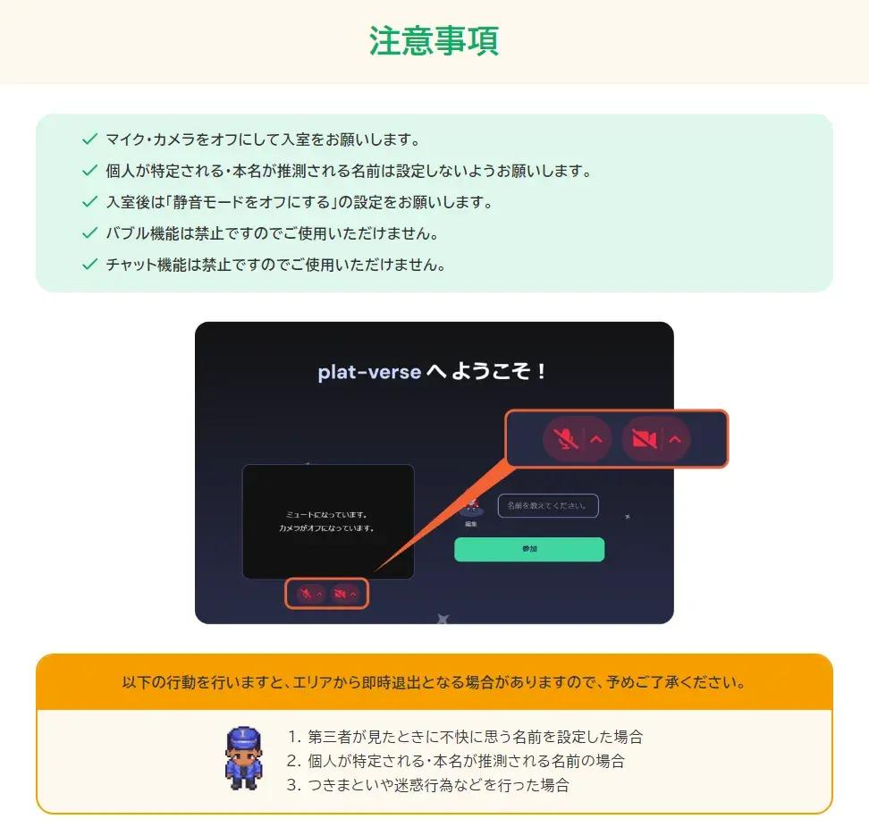 而任何違反了這些事項並被警備員發現的用戶,都會被踢出Plat-Verse,乃至禁止訪問。