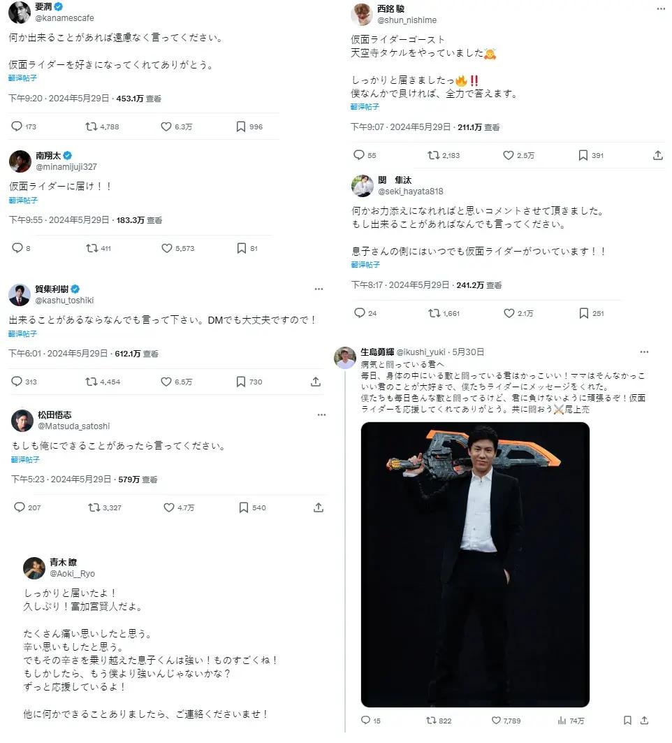 在他的帶動下,更多參演過《假面騎士》系列的演員開始留言和轉發原博,包括《假面騎士龍騎》的主演松田悟志、《假面騎士亞極陀》的主演賀集利樹和要潤、《假面騎士Ghost》的主演西銘駿、《假面騎士聖刃》的主演青木瞭等人,都來爲患兒留下加油打氣的話語。