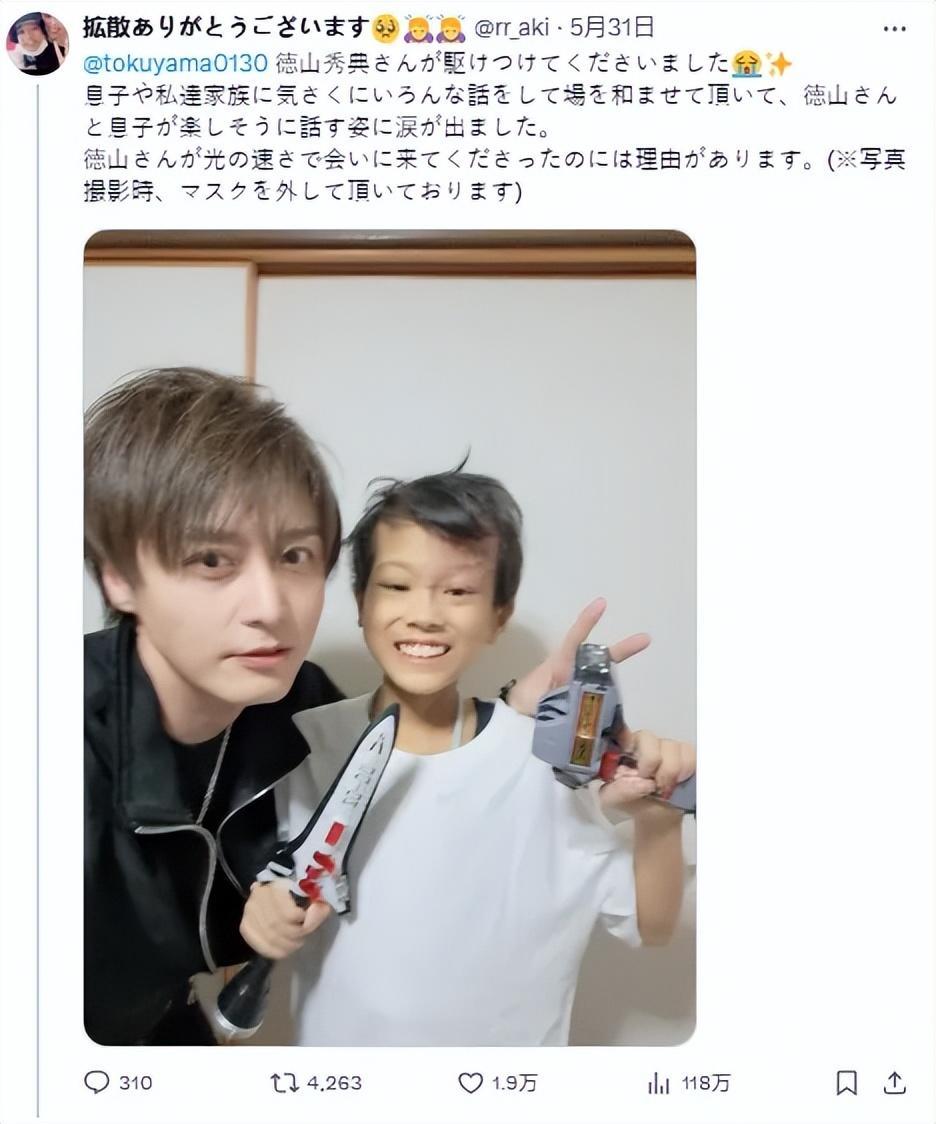 在5月31日,患兒的母親在X上提到曾出演《假面騎士KABUTO》的德川秀典前來探望了孩子,併發出了一張合影。