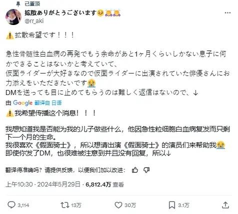 5月29日,一位X賬號名爲“拡散ありがとうございます”(中文意爲“感謝您的轉發”)的日本網友發佈了一條推文,說自己的孩子因爲急性粒細胞白血病復發,預計僅剩下1個月的壽命。