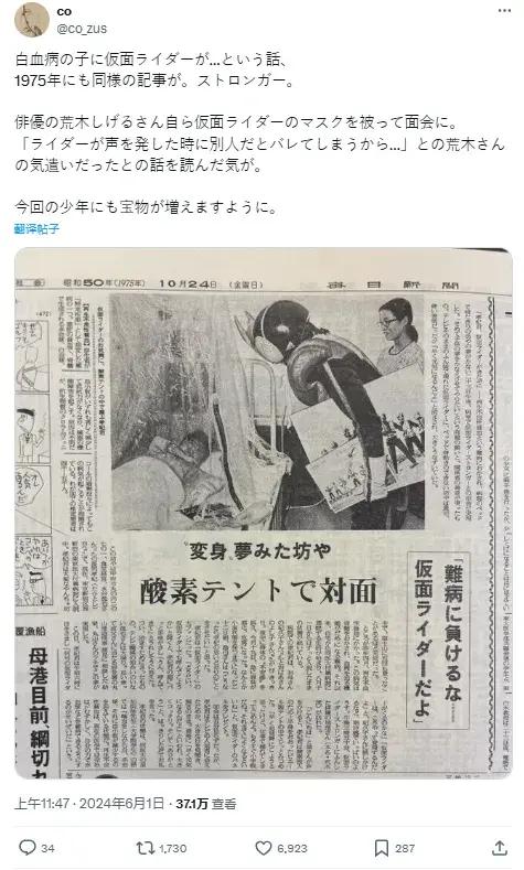 有人翻出過去的舊報紙,提起在1975年,《假面騎士Stronger》的演員荒木茂也曾裝扮成假面騎士去探望一名白血病患兒。《假面騎士》系列跨越五十餘年曆程所傳遞的精神,在此刻迴響。