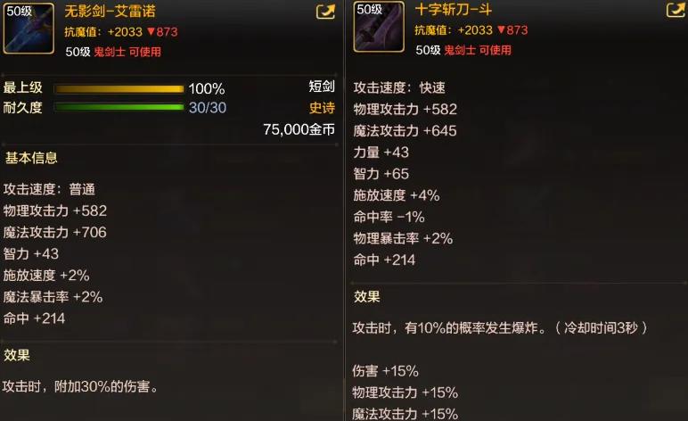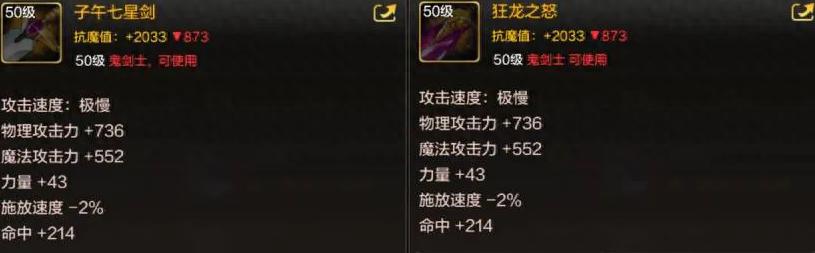 2把武器基礎屬性都是一樣的,都增加“736物攻+43力量”,因此主要比較下附加效果的差異。