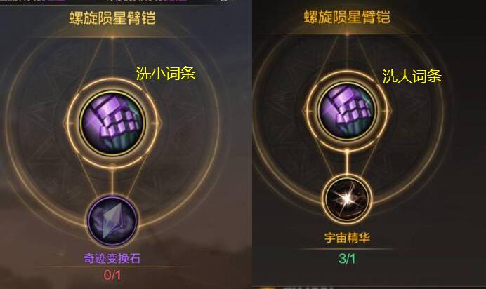 【1】直接用“材料”洗詞條,小詞條需要用到“奇蹟變換石”,大詞條 需要用到“宇宙精華”。