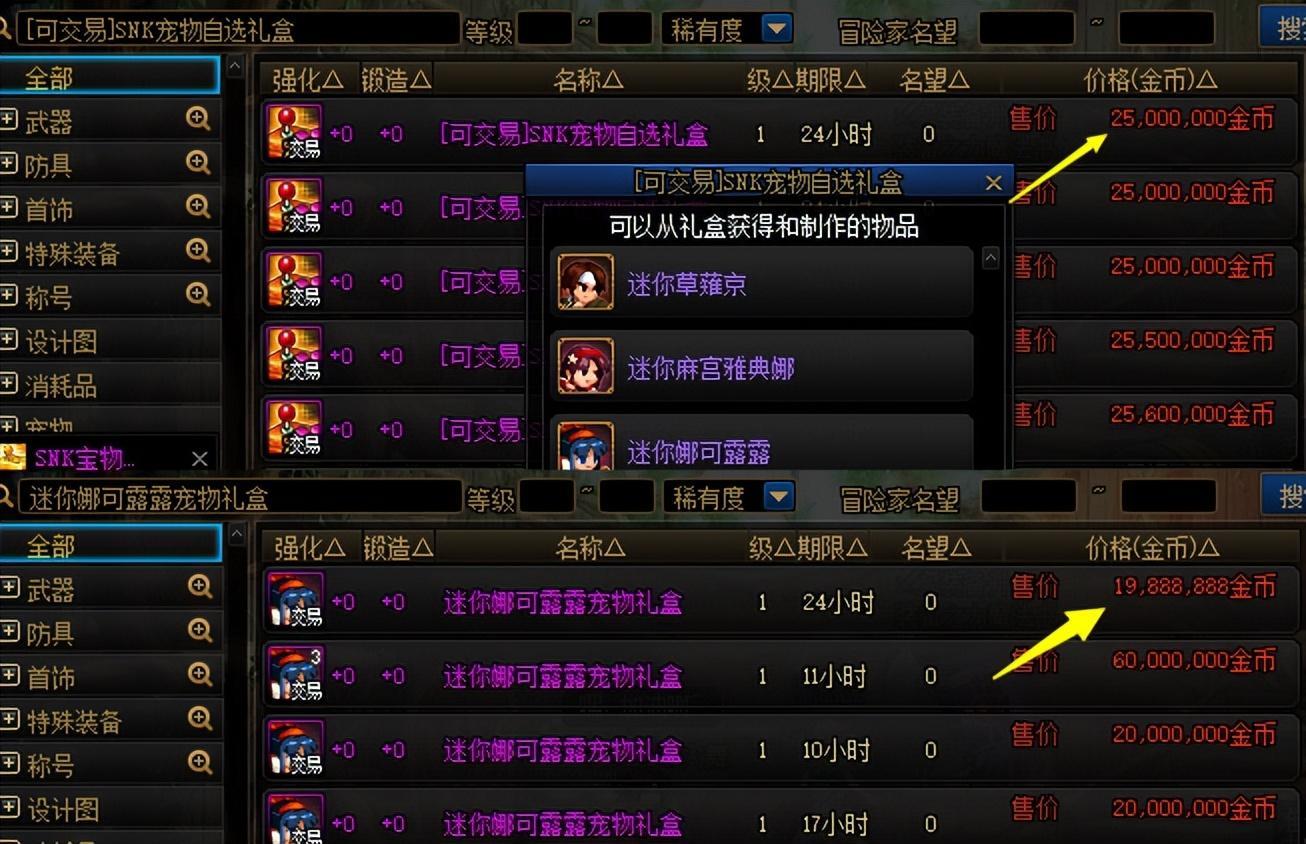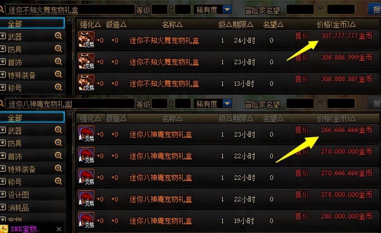 “迷你不知火舞寵物”售價3億金幣,而“迷你八神庵寵物”售價2.7億金幣。