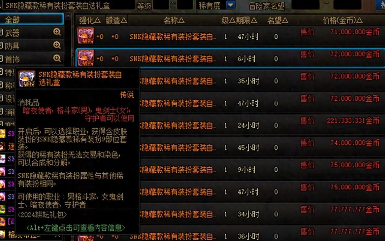 如果直接搜索「SNK隱藏款稀有裝扮套裝自選禮盒」,那麼會彈出耕耘至尊時裝的自選禮盒,可以從4個職業的至尊時裝中任選一套獲取,目前售價在7100萬左右!