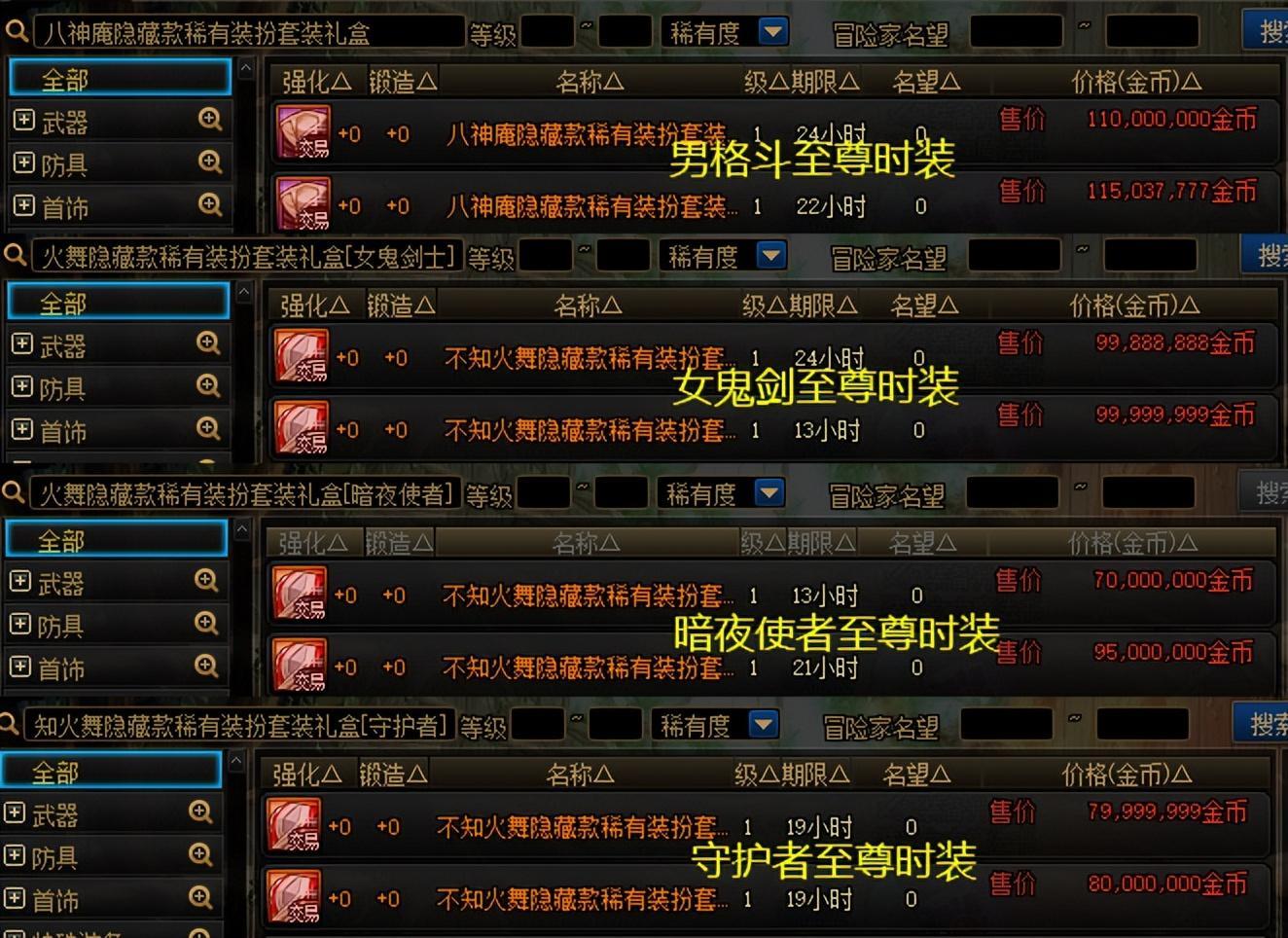 而如果單獨搜索某一個職業的至尊時裝,比如「八神庵隱藏款稀有套裝」、或者「不知火舞隱藏款稀有裝扮套裝(女鬼劍、暗夜、守護者)」;