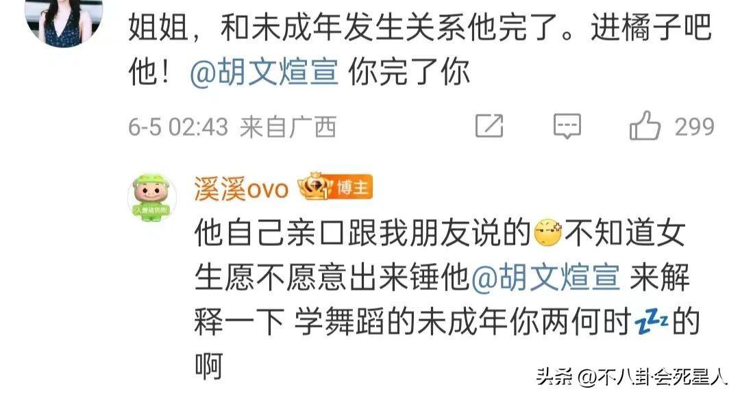 評論區有網友提問,胡文煊是不是真的和未成年發生關係,如果是那他就完了,爆料者稱胡文煊親口和她朋友說的,就是不知道那個女生願不願意出來錘他。