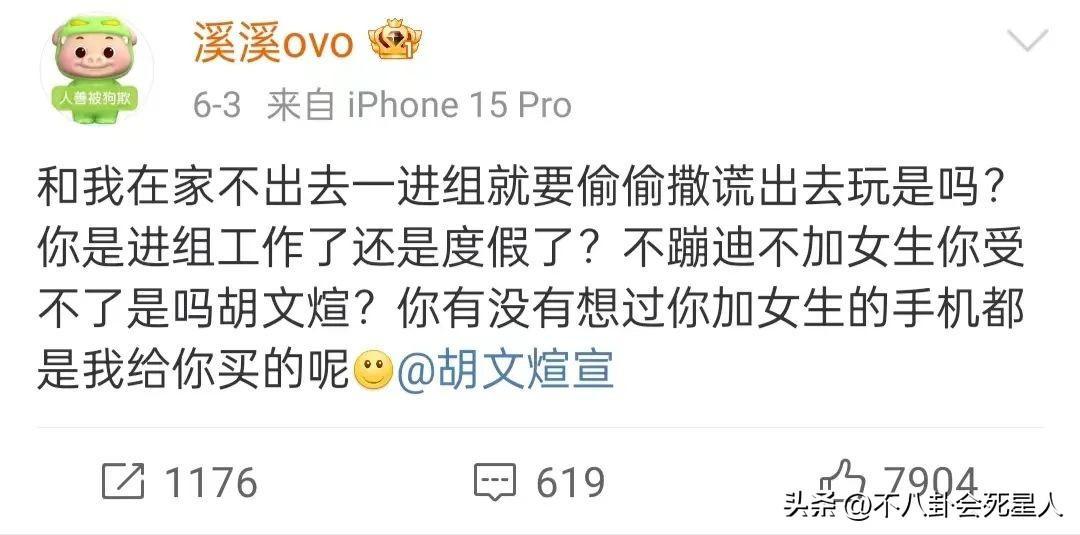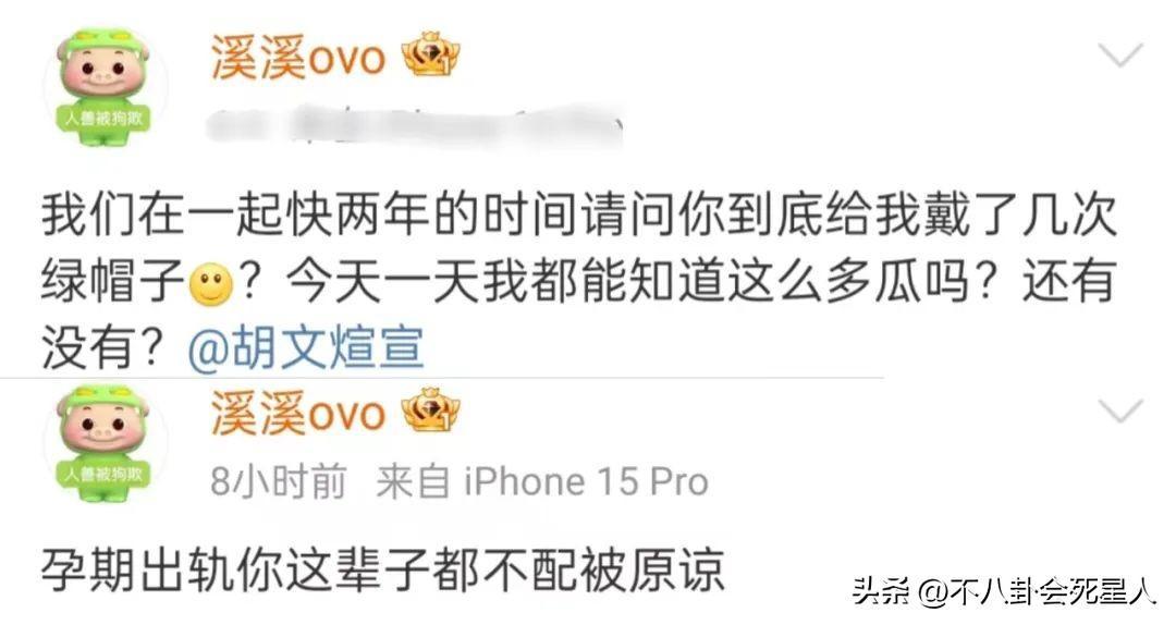 事情是這樣的,一個網名爲溪溪ovo的網友,自稱是胡文煊的女友,她爆料稱胡文煊在其孕期出軌,交往快兩年多次給她戴綠帽。