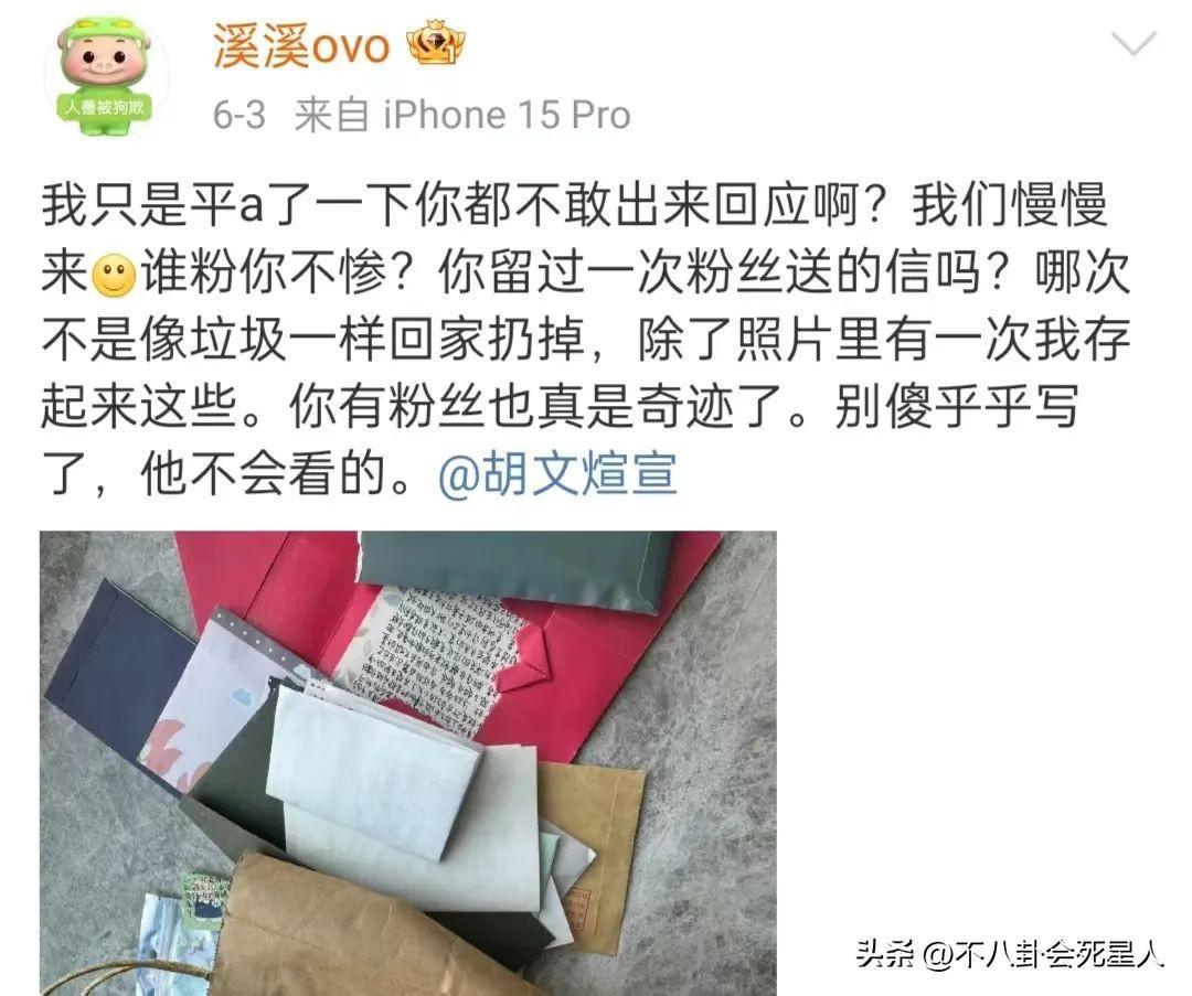 另外,她還爆料稱胡文煊私下人品堪憂,表面上愛護粉絲,實際上根本不在意粉絲,轉頭就把粉絲送的信當成垃圾一樣丟掉,奉勸粉絲清醒一點,別再給胡文煊寫信了。