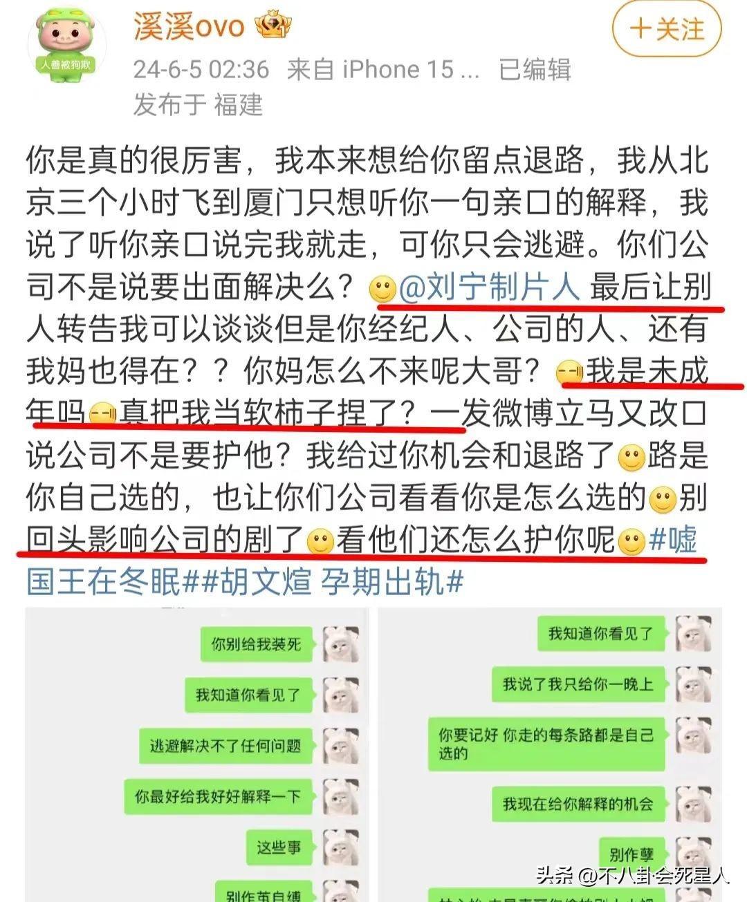 這名爆料者喊話胡文煊的老闆劉寧,希望能出面回應給個說法,不要裝聾作啞,把她當軟柿子捏,別回頭影響公司的劇。